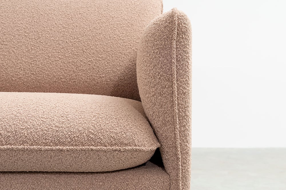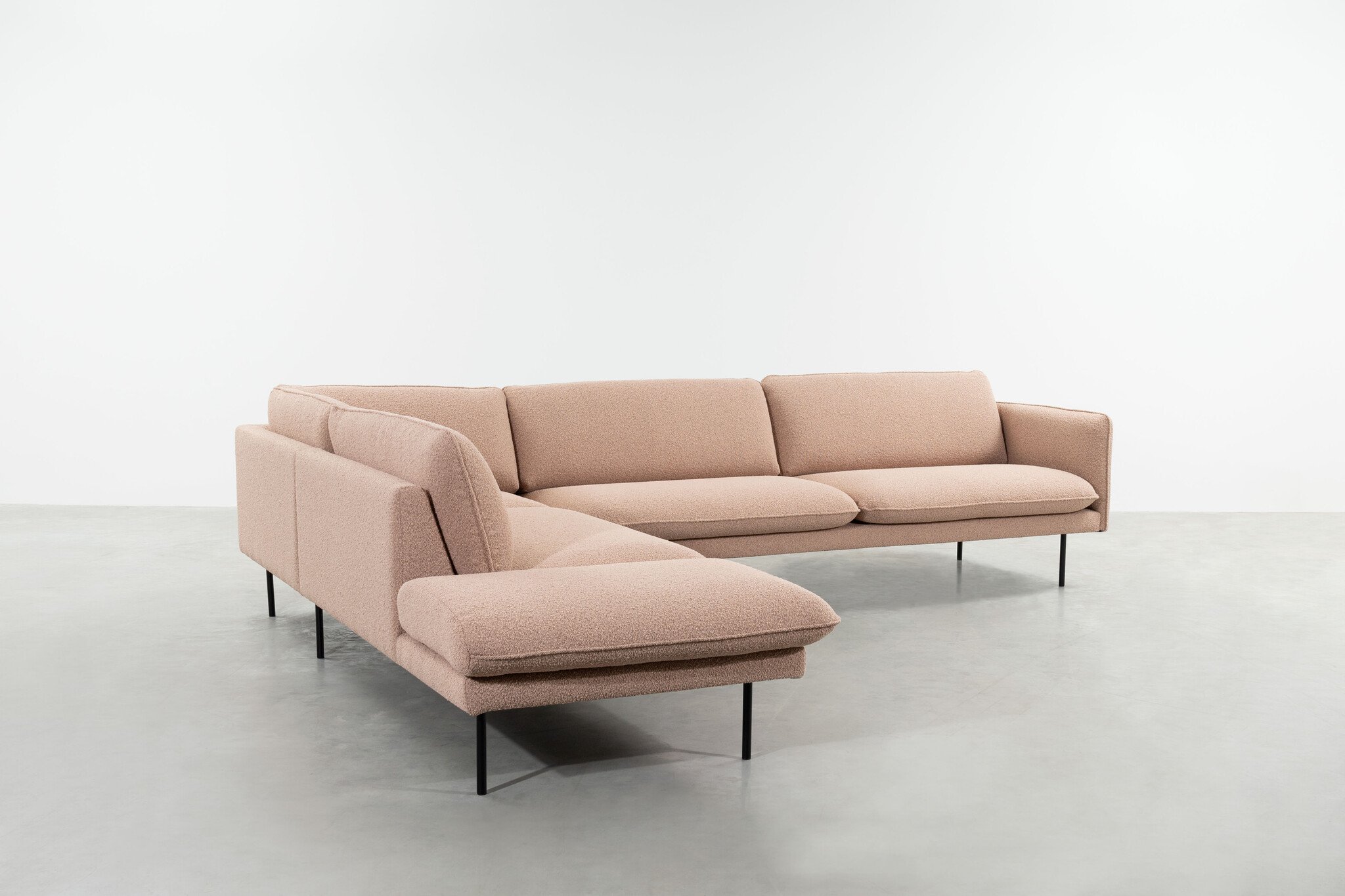 The legs of our Jolin sofa may look slim, but they are sturdy and available in black powder-coated steel or wood. All cushions are secured to the frame with Velcro to keep them neatly in place. At first glance, the sofa may resemble the Rølde, but there are notable differences: Jolin's cushions are finished with piping along the seams, and the backrest of the corner element has a triangular shape.