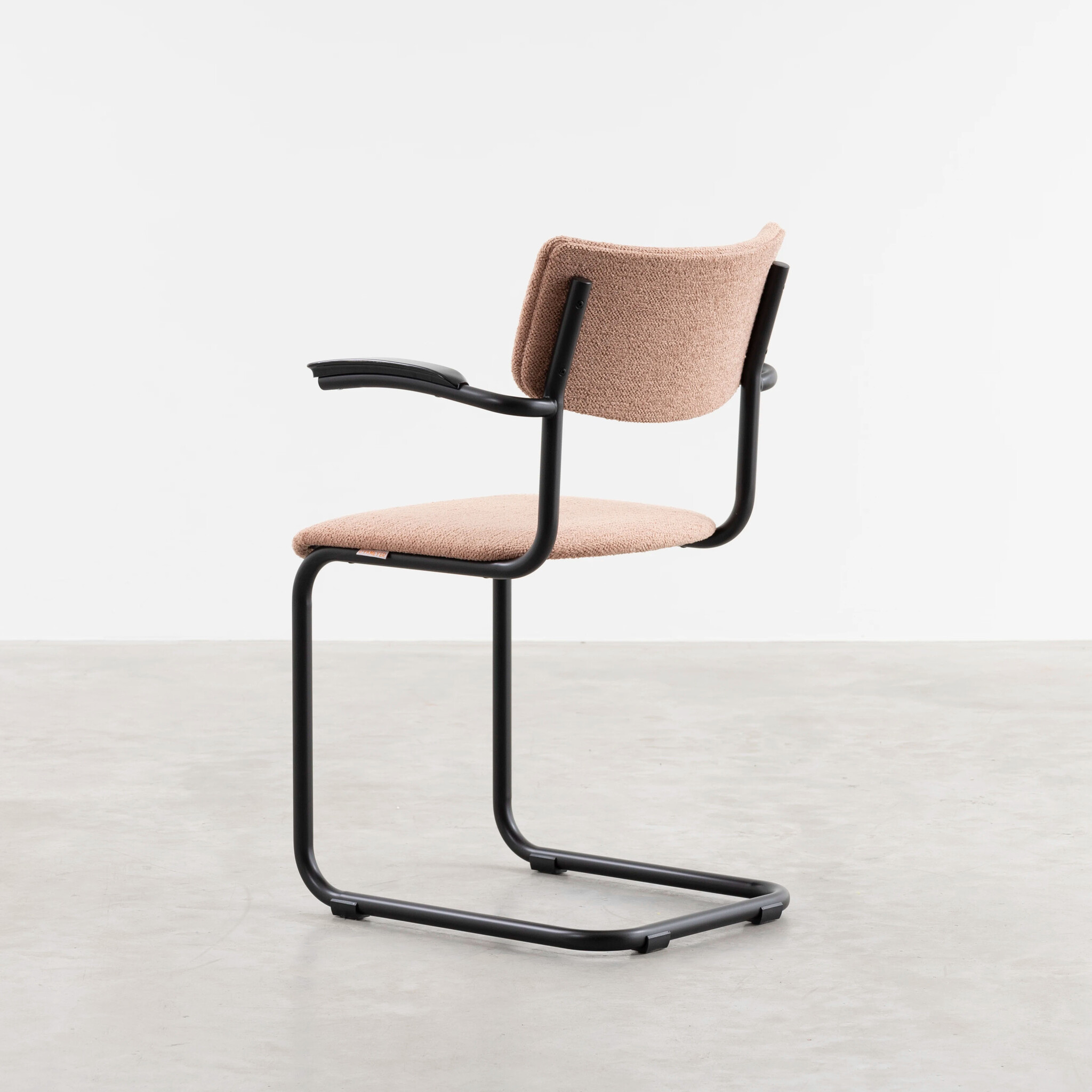 The Dykmeyer De Purmer is a tubular frame cantilever chair. Inspired by the Avant Garde chairs from the 1930s. The chair has a modern industrial look. With a good seat, it is an ideal dining room chair. The tubular frame has right angles and runs parallel to each other from the carriage to the backrest. Due to the kink in the tubular frame, the backrest is slightly tilted. This provides the right support for a delicious meal. The Bakelite armrests ensure that your arms also receive support. With its solid quality, the De Dykmeyer Purmer is suitable for catering, business and private use.