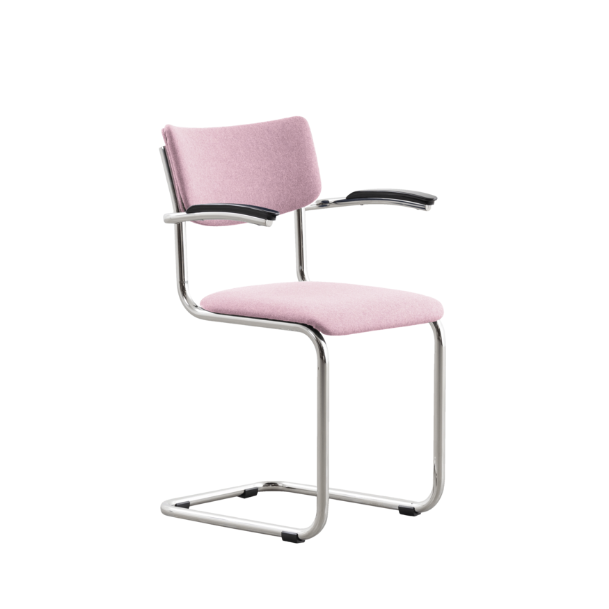 The Dykmeyer De Purmer is a tubular frame cantilever chair. Inspired by the Avant Garde chairs from the 1930s. The chair has a modern industrial look. With a good seat, it is an ideal dining room chair. The tubular frame has right angles and runs parallel to each other from the carriage to the backrest. Due to the kink in the tubular frame, the backrest is slightly tilted. This provides the right support for a delicious meal. The Bakelite armrests ensure that your arms also receive support. With its solid quality, the De Dykmeyer Purmer is suitable for catering, business and private use.