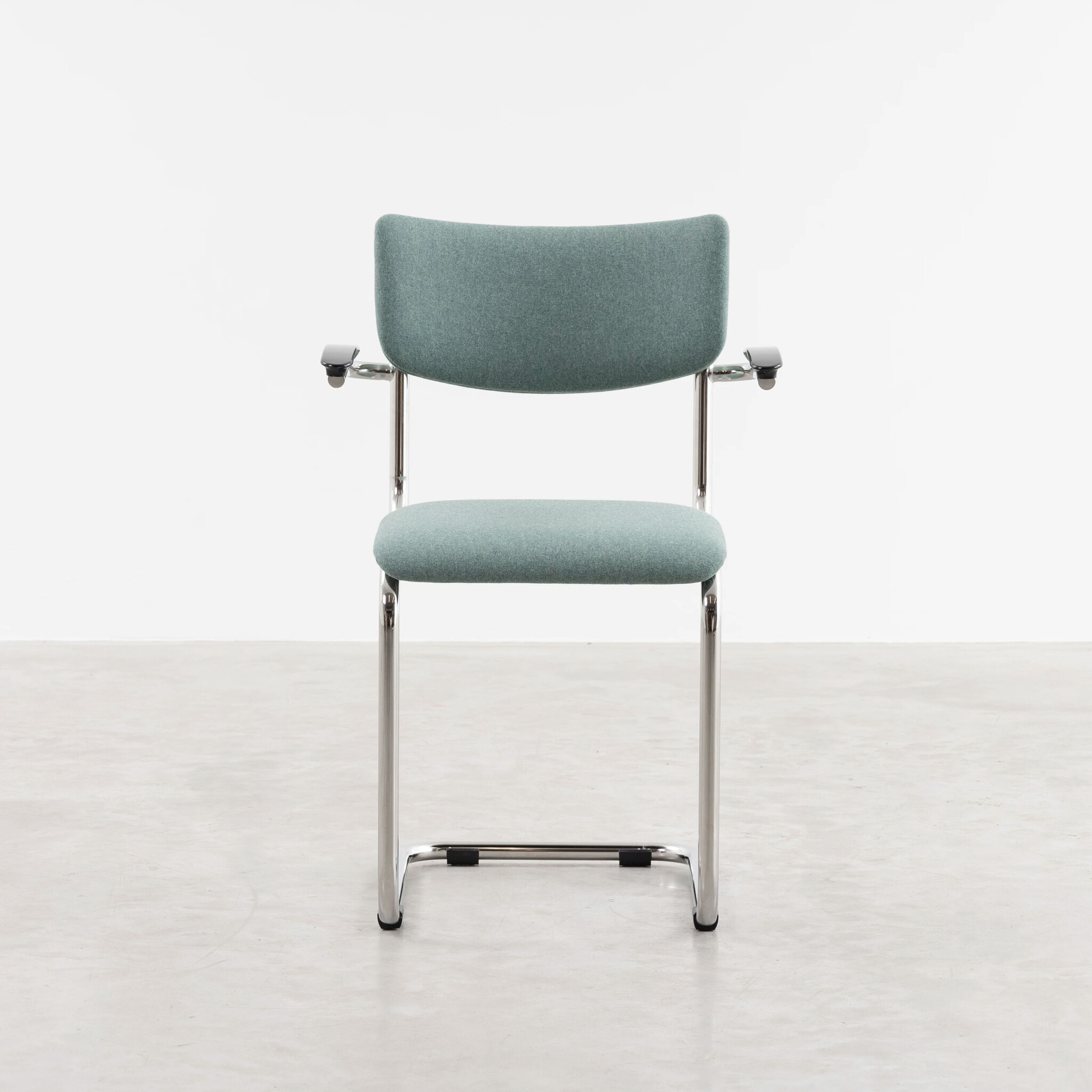 The Dykmeyer De Purmer is a tubular frame cantilever chair. Inspired by the Avant Garde chairs from the 1930s. The chair has a modern industrial look. With a good seat, it is an ideal dining room chair. The tubular frame has right angles and runs parallel to each other from the carriage to the backrest. Due to the kink in the tubular frame, the backrest is slightly tilted. This provides the right support for a delicious meal. The Bakelite armrests ensure that your arms also receive support. With its solid quality, the De Dykmeyer Purmer is suitable for catering, business and private use.