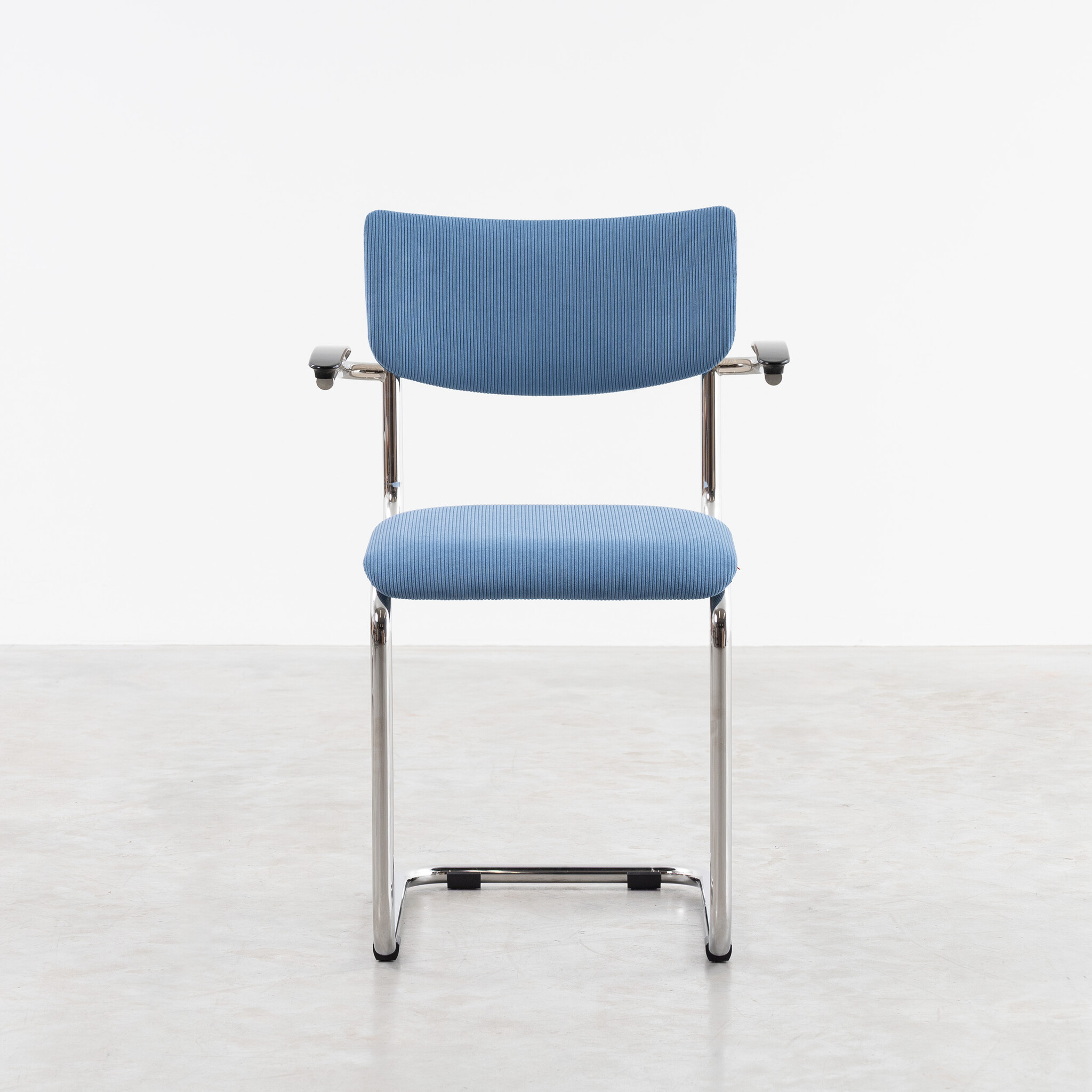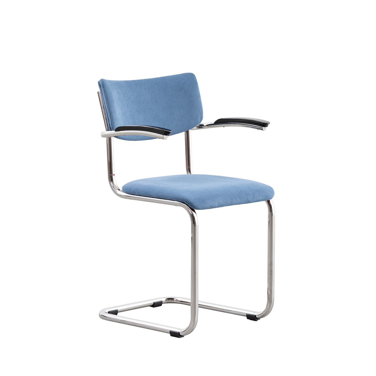 The Dykmeyer De Purmer is a tubular frame cantilever chair. Inspired by the Avant Garde chairs from the 1930s. The chair has a modern industrial look. With a good seat, it is an ideal dining room chair. The tubular frame has right angles and runs parallel to each other from the carriage to the backrest. Due to the kink in the tubular frame, the backrest is slightly tilted. This provides the right support for a delicious meal. The Bakelite armrests ensure that your arms also receive support. With its solid quality, the De Dykmeyer Purmer is suitable for catering, business and private use.