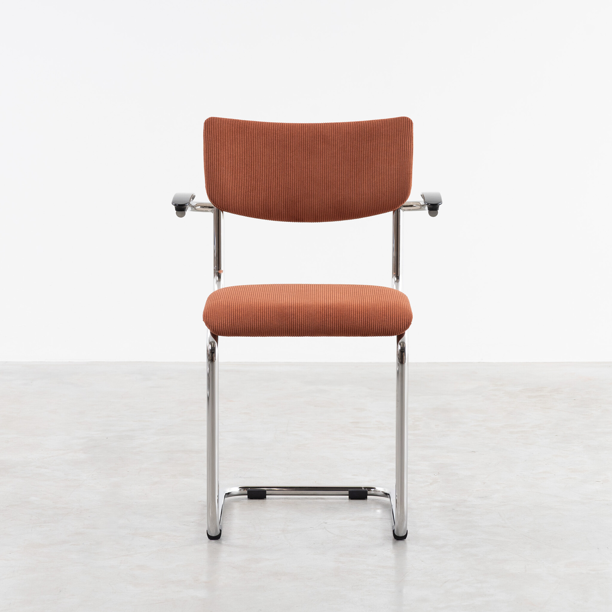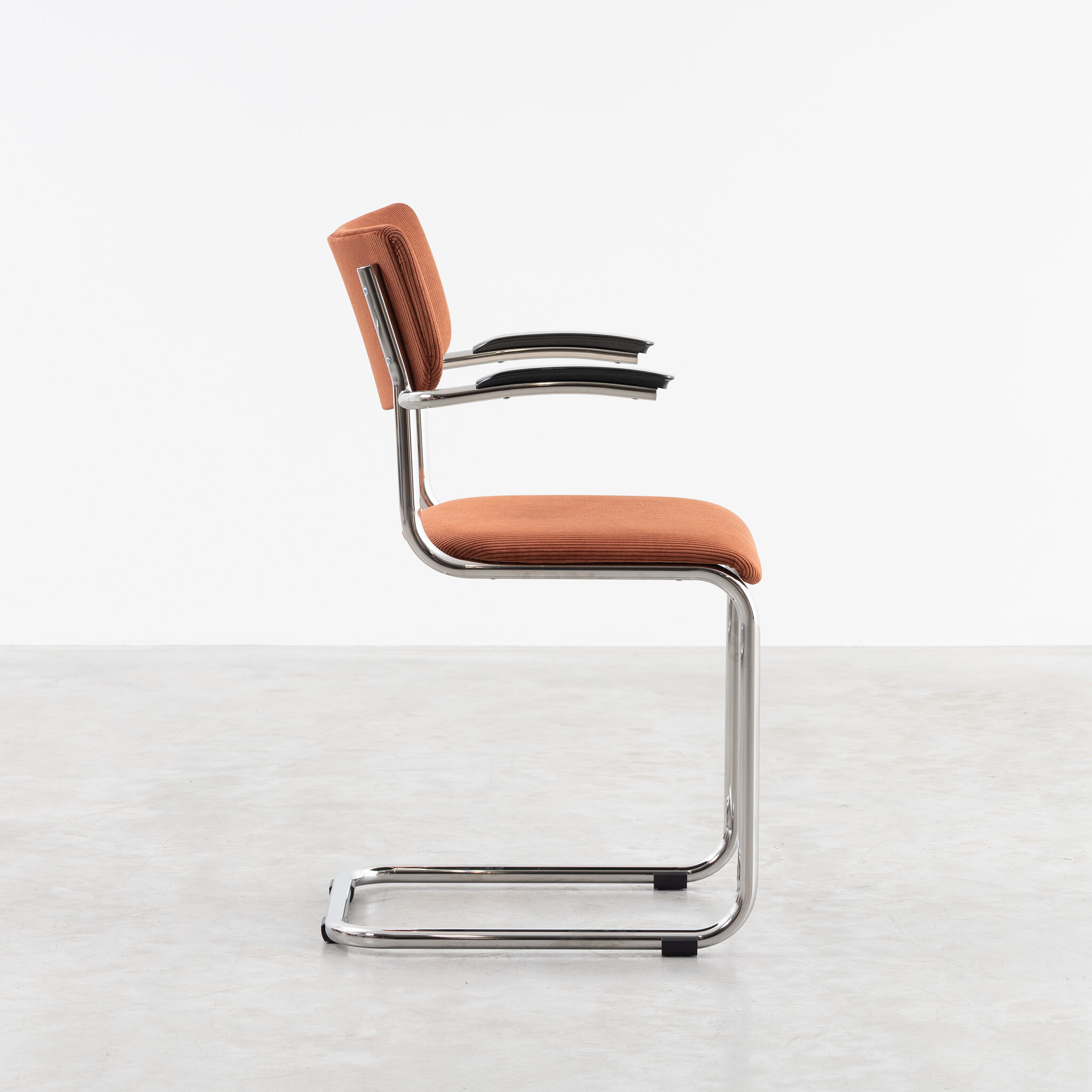 The Dykmeyer De Purmer is a tubular frame cantilever chair. Inspired by the Avant Garde chairs from the 1930s. The chair has a modern industrial look. With a good seat, it is an ideal dining room chair. The tubular frame has right angles and runs parallel to each other from the carriage to the backrest. Due to the kink in the tubular frame, the backrest is slightly tilted. This provides the right support for a delicious meal. The Bakelite armrests ensure that your arms also receive support. With its solid quality, the De Dykmeyer Purmer is suitable for catering, business and private use.