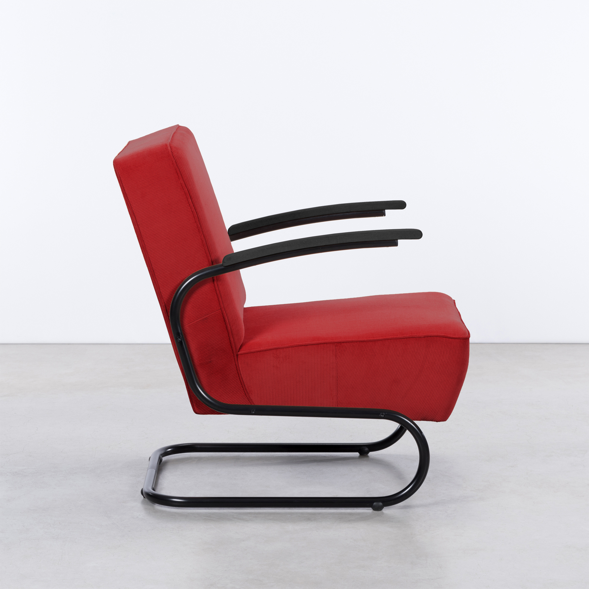 This sled design armchair is available in different types and colours of fabric. The Zwaan is available as standard in Manchester rib fabrics. It is also possible to choose one of the many other fabrics we have. We have fabrics from Keymer, Lancier, Textaafoam, Kvadrat, De Ploeg, Bute, Silvera. You can view the fabrics in our showrooms!