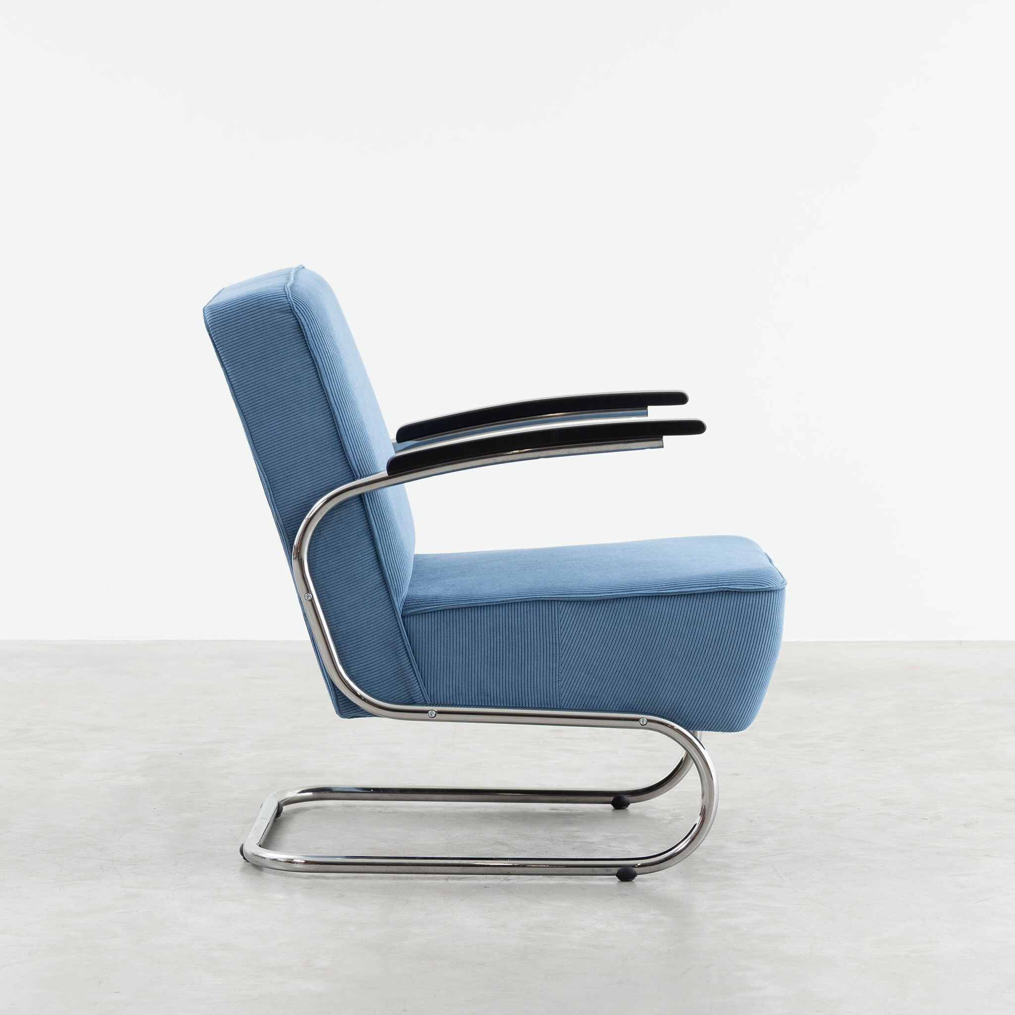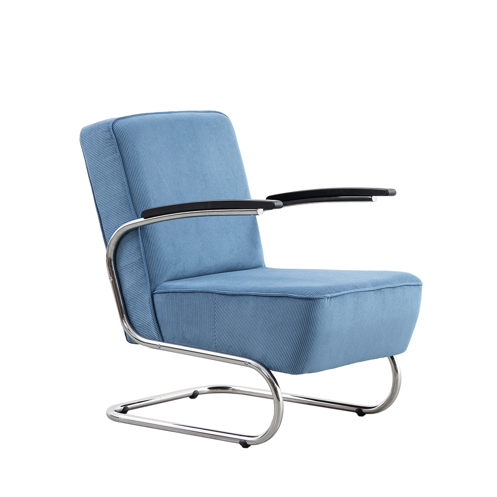 The tubular frame armchair 'De Dykmeyer de Zwaan' is a wonderful tubular frame armchair to relax in. The sledge frame ensures that this armchair remains rock-solid. Because the frame is legless, the armchair has a comfortable resilience. The frame is consists of one whole and has its beginning and end at the armrests. The armrests are equipped with wood.