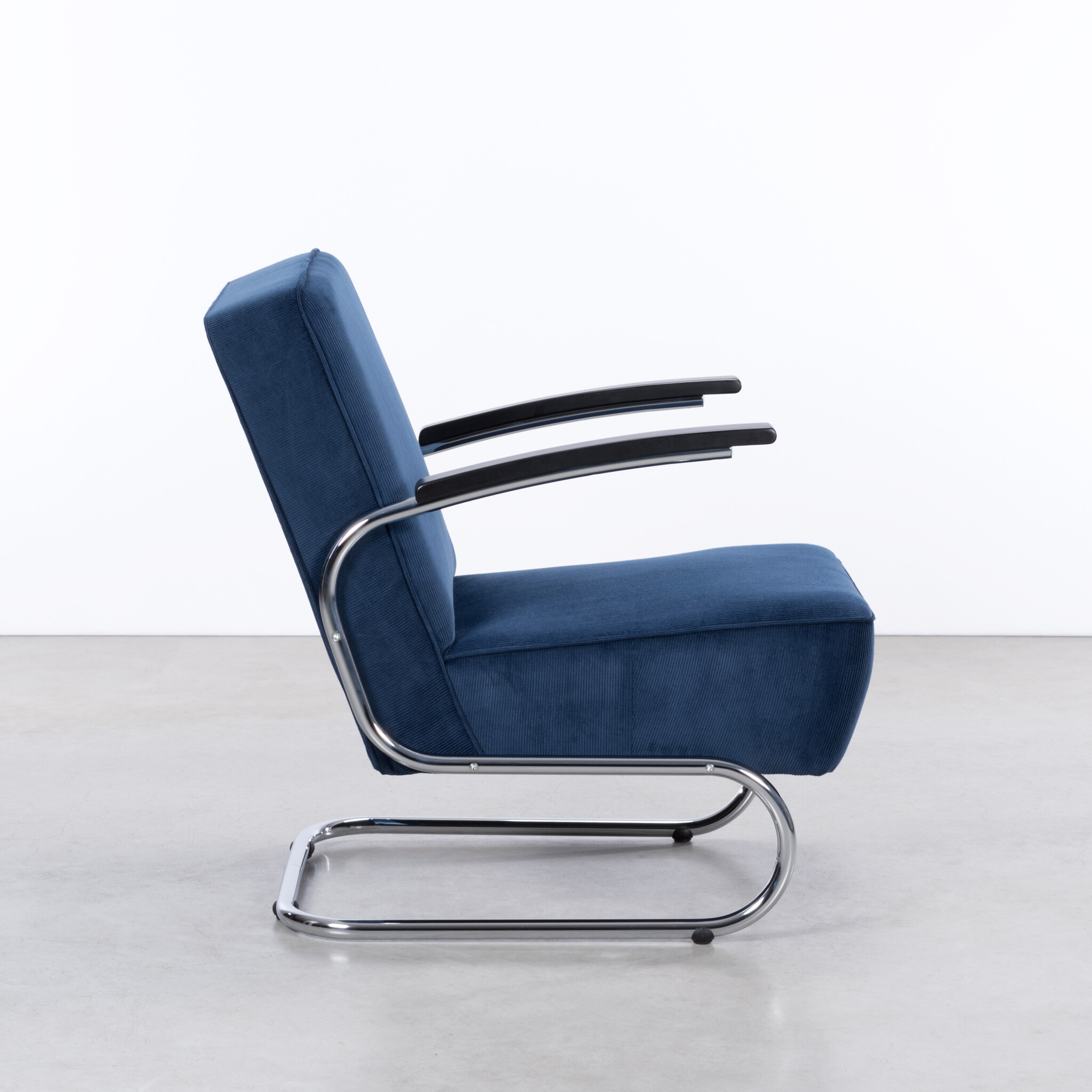 The tubular frame armchair 'De Dykmeyer de Zwaan' is a wonderful tubular frame armchair to relax in. The sledge frame ensures that this armchair remains rock-solid. Because the frame is legless, the armchair has a comfortable resilience. The frame is consists of one whole and has its beginning and end at the armrests. The armrests are equipped with wood.