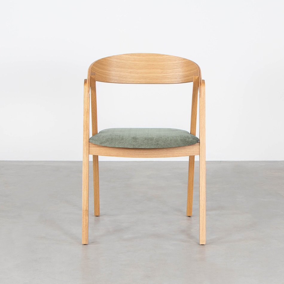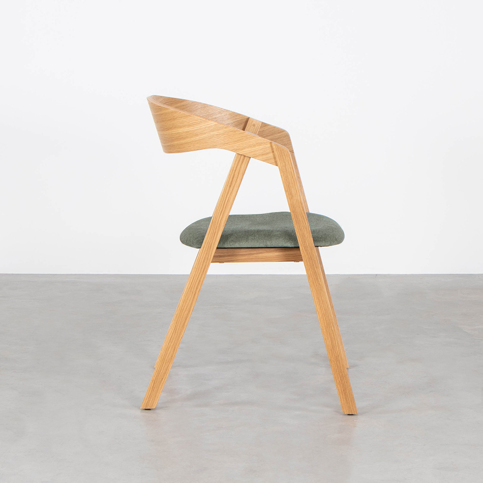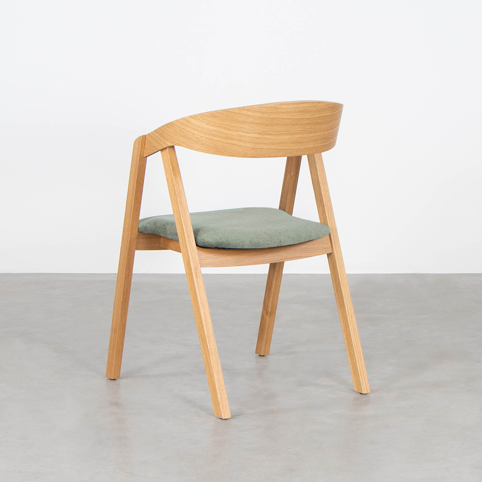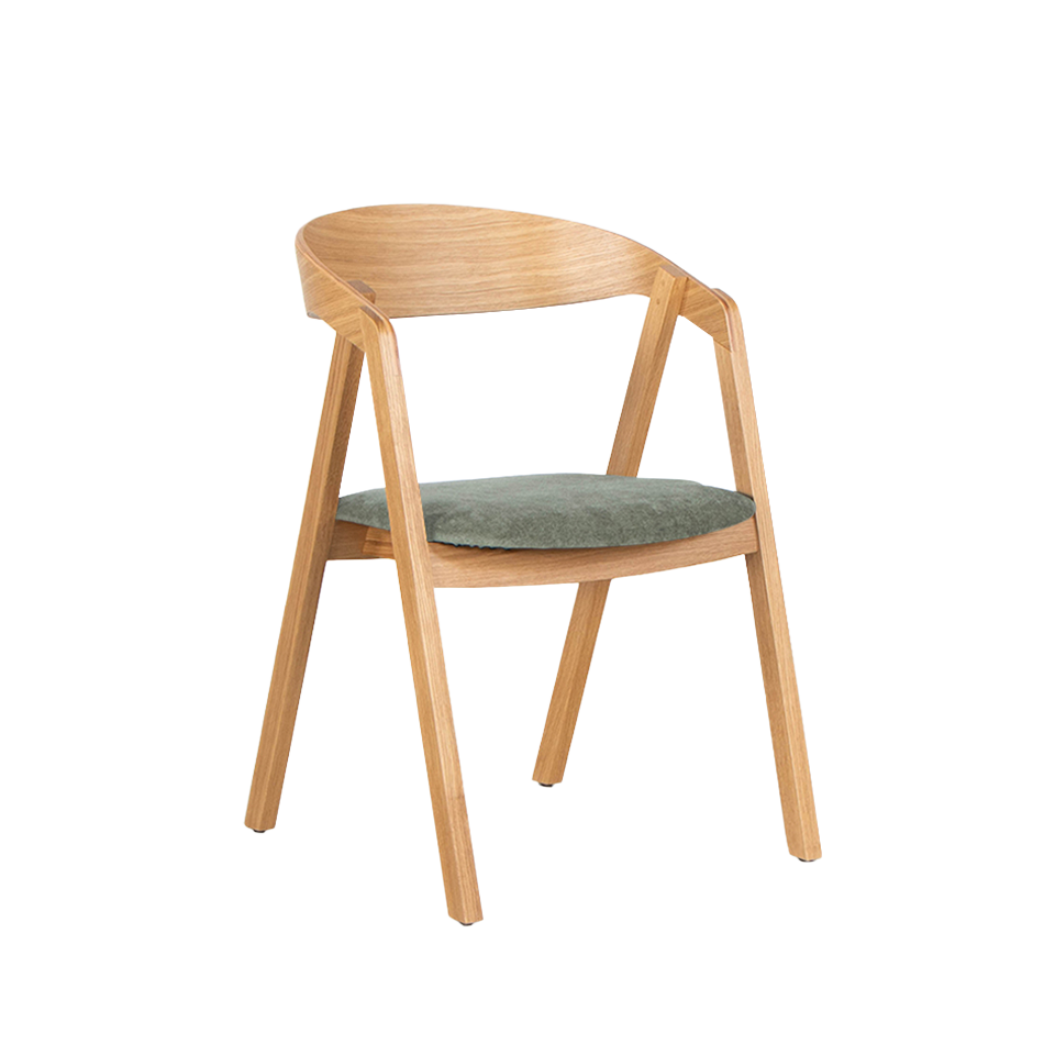 The Edske is a compact, well-shaped and comfortable dining room chair with Scandinavian design. Designed from a practical and down-to-earth point of view. Made of high-quality oak, by real craftsmen in Europe. Characteristic is the minimalist design, the round shapes and beautiful finish of this dining room chair. The chair has a frame construction in which the leg continues and thus supports the backrest. The curved backrest provides a natural shape and optimal comfort. Available in natural oak, black stained or beech walnut stained, with wooden or upholstered seat.