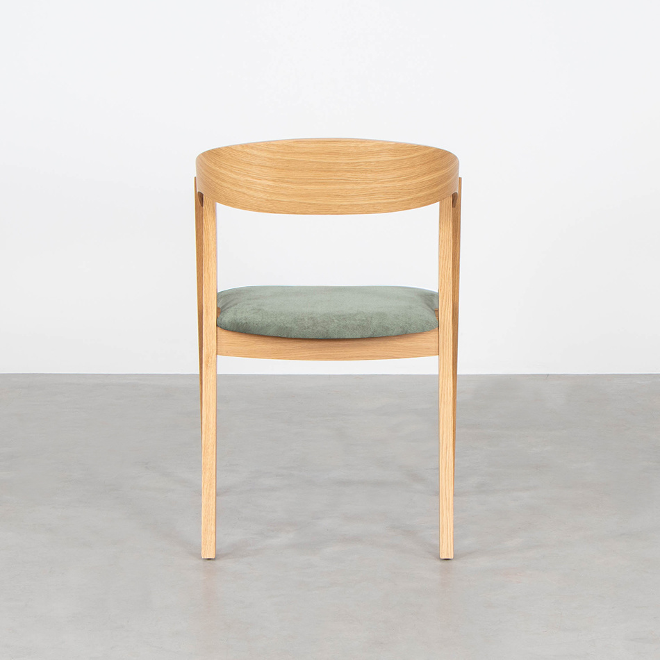 The Edske is a compact, well-shaped and comfortable dining room chair with Scandinavian design. Designed from a practical and down-to-earth point of view. Made of high-quality oak, by real craftsmen in Europe. Characteristic is the minimalist design, the round shapes and beautiful finish of this dining room chair. The chair has a frame construction in which the leg continues and thus supports the backrest. The curved backrest provides a natural shape and optimal comfort. Available in natural oak, black stained or beech walnut stained, with wooden or upholstered seat.