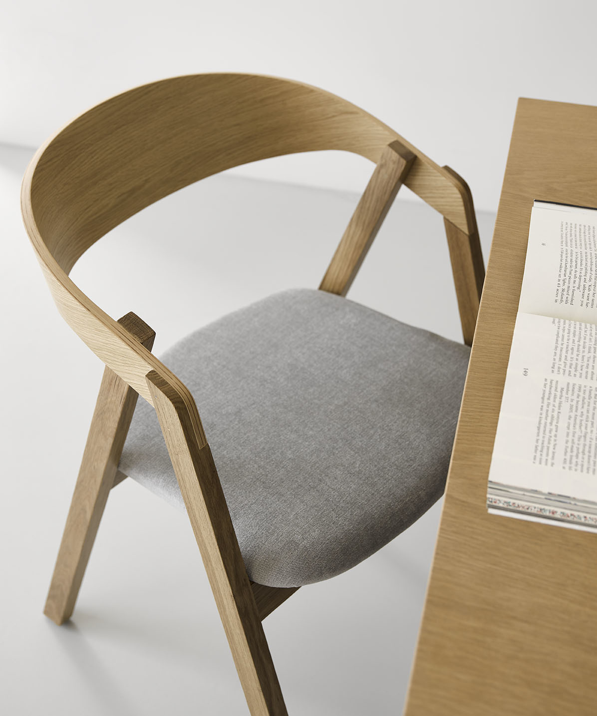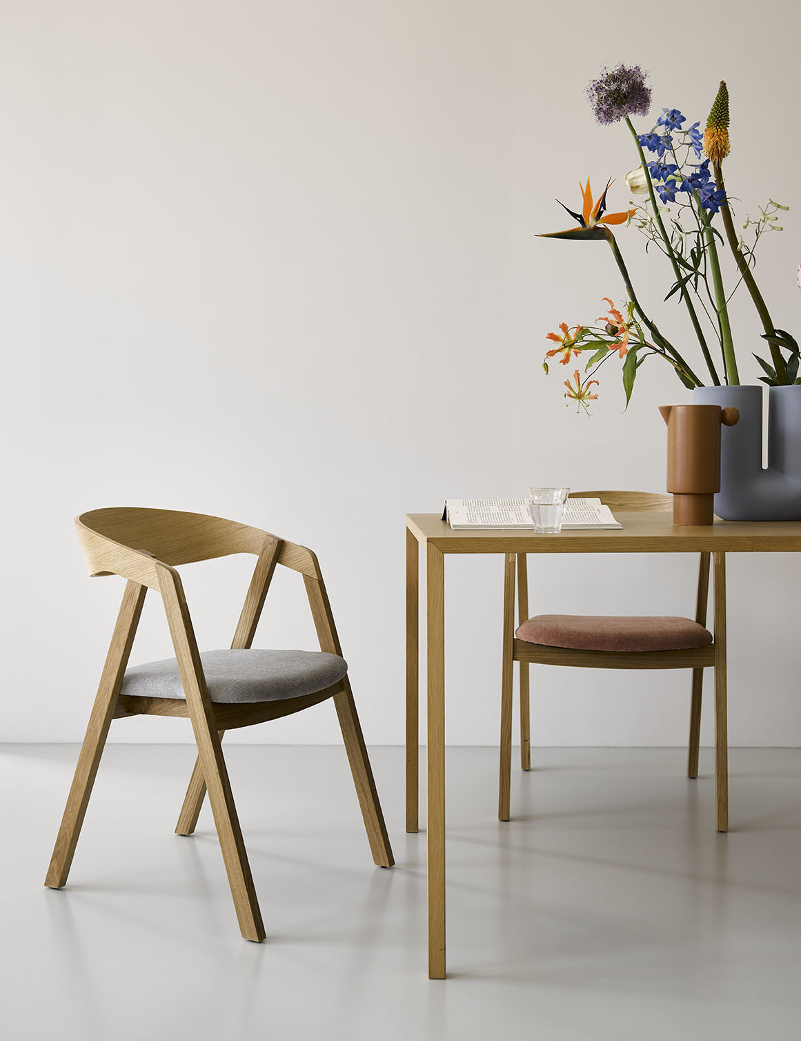 This Edske chair is available in natural oak with an upholstered seat in different types and colours of fabric. The chair is available in Comeback fabrics as standard. It is also possible to choose one of the many other fabrics we have. We have fabrics from Keymer, Lancier, Textaafoam, Kvadrat, De Ploeg, Bute and Silvera. You can come and see the fabrics in our showrooms and get advice from our employees.