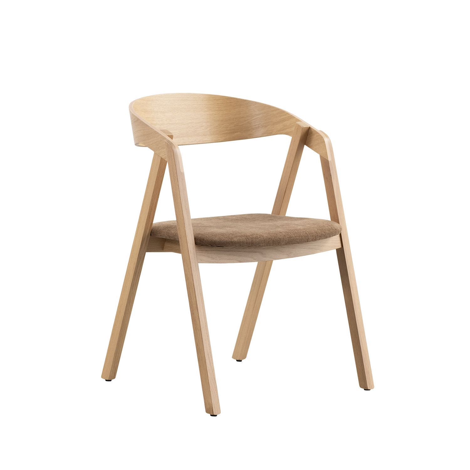 The Edske is a compact, well-shaped and comfortable dining room chair with Scandinavian design. Designed from a practical and down-to-earth point of view. Made of high-quality oak, by real craftsmen in Europe. Characteristic is the minimalist design, the round shapes and beautiful finish of this dining room chair. The chair has a frame construction in which the leg continues and thus supports the backrest. The curved backrest provides a natural shape and optimal comfort. Available in natural oak, black stained or beech walnut stained, with wooden or upholstered seat.