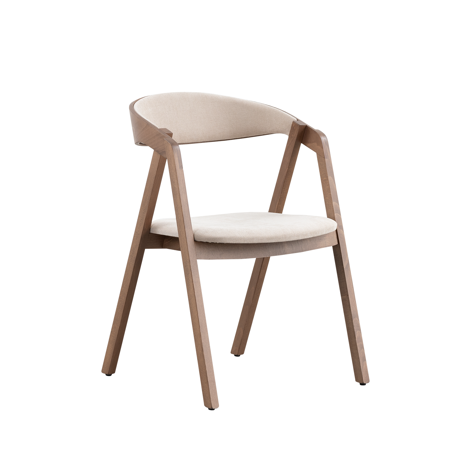 The Edske, with an upholstered back and seat, is available in matte lacquered oak and walnut-colored beech in various Olympus fabric colors.
