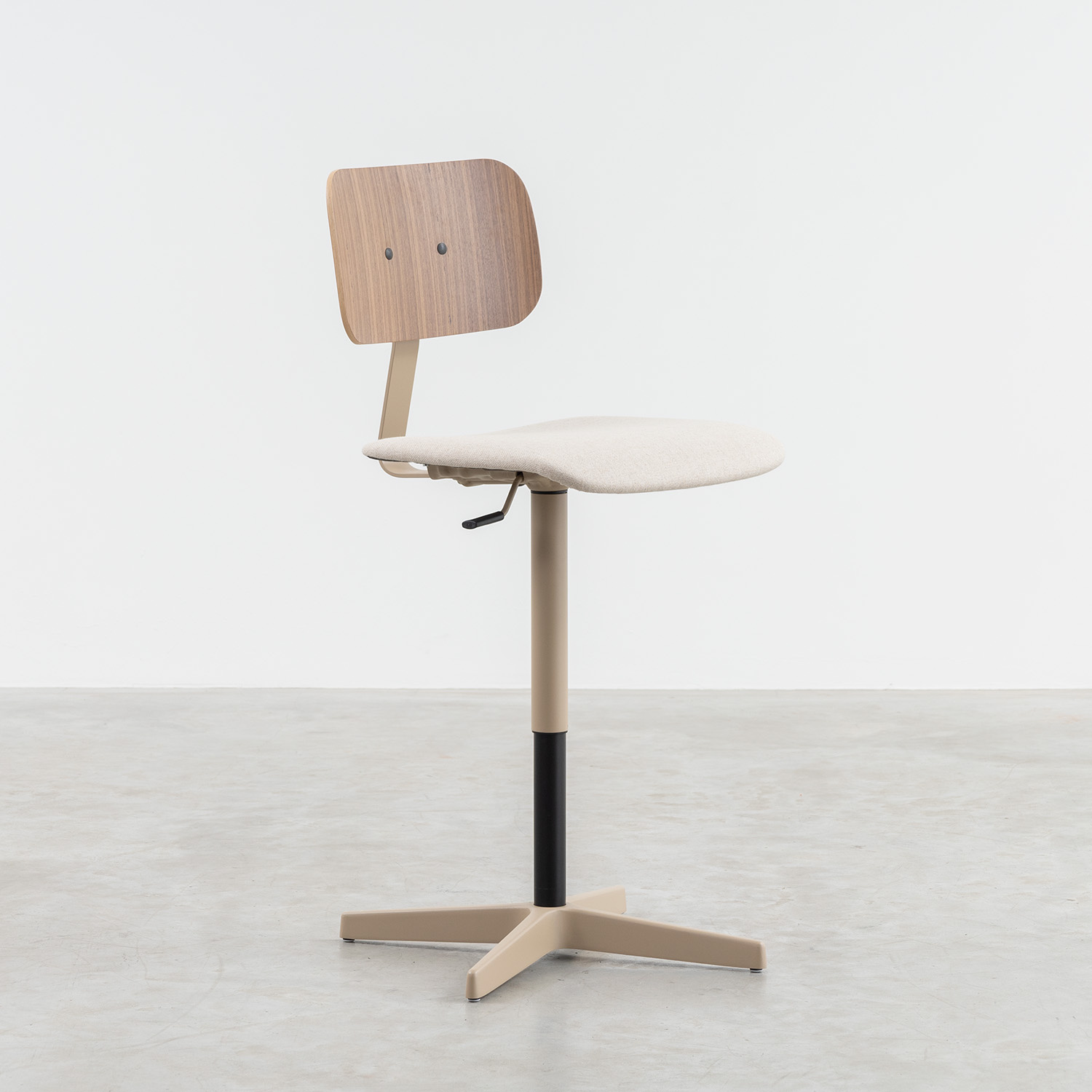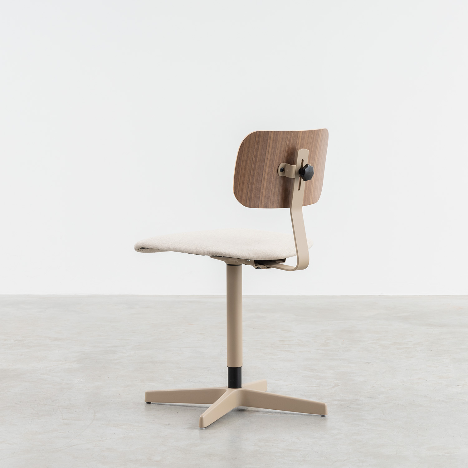 The backrest is finished in walnut veneer, and the seat is upholstered. Both elements are also available fully in oak or walnut veneer.