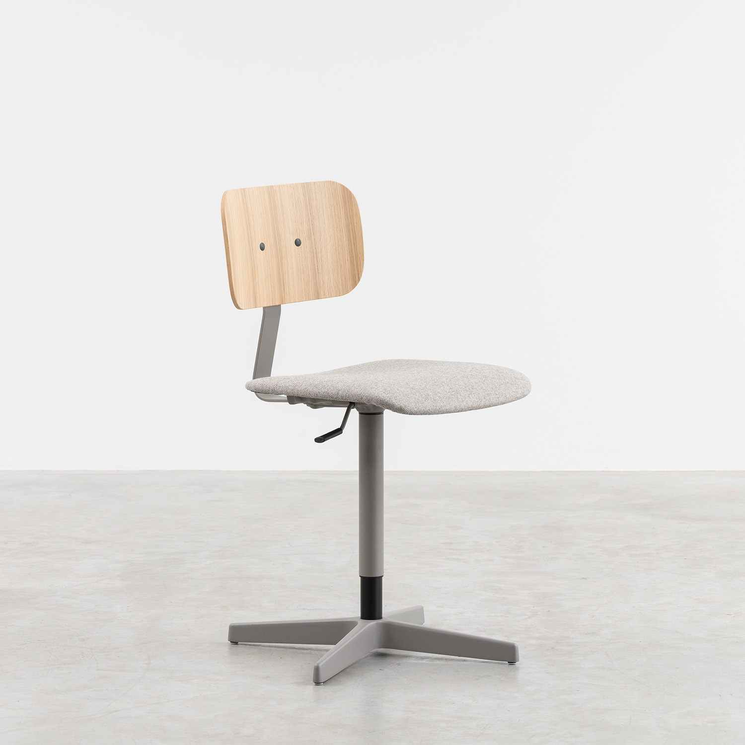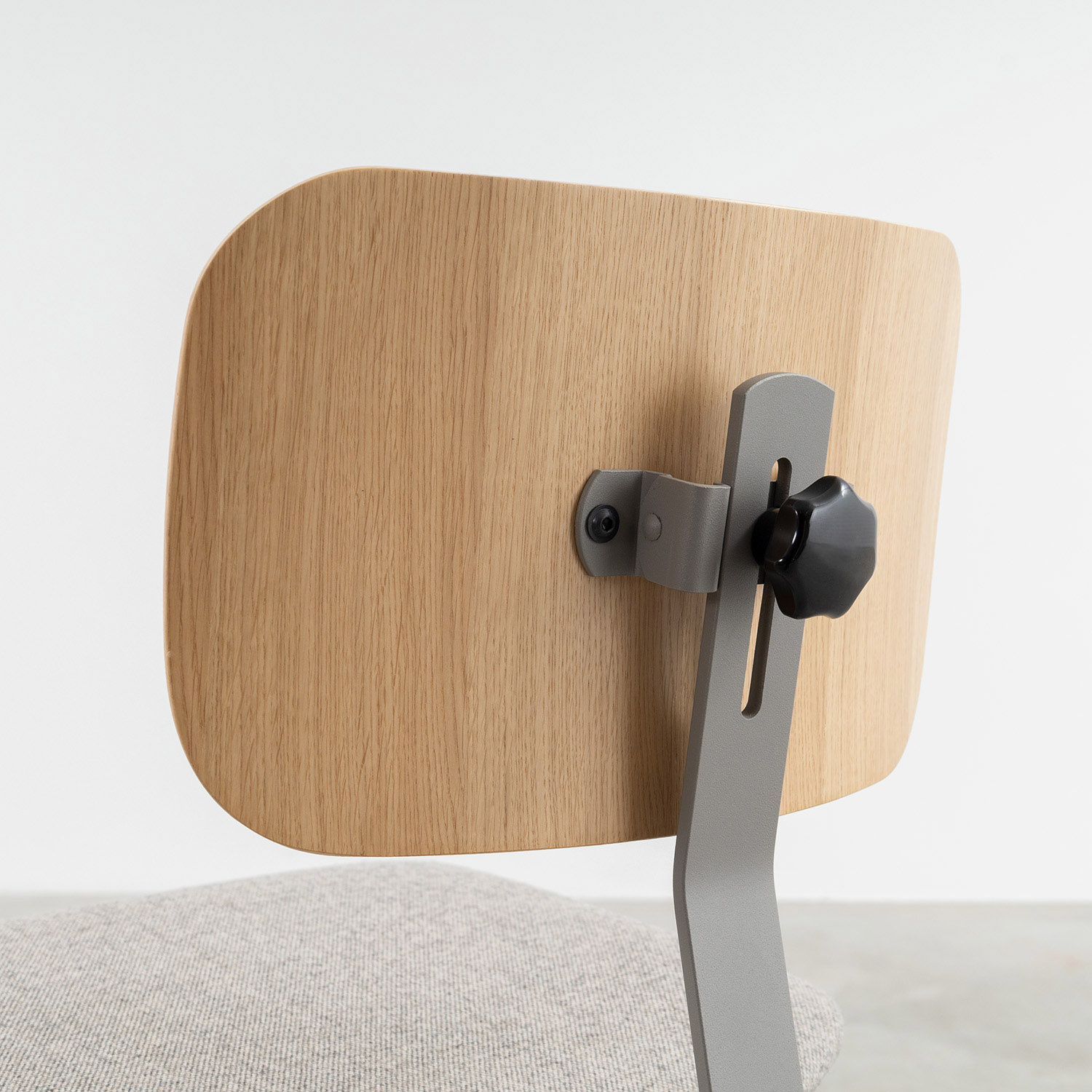 The backrest is finished in oak veneer, and the seat is upholstered. Both elements are also available fully in oak or walnut veneer.