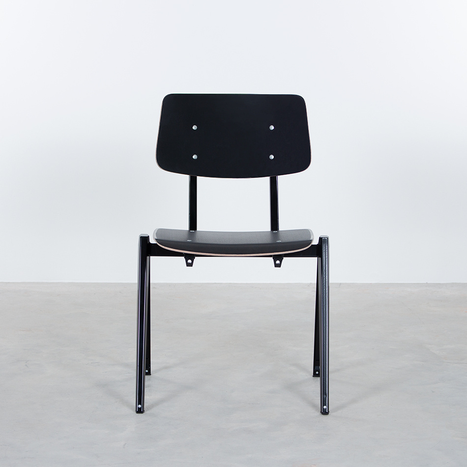 The chair was designed and produced by Galvanitas in Oosterhout in the late 1950s and early 1960s. Instead of the usual tubular construction, the designer opted for a frame made of pressed sheet steel, which resulted in a revolutionary and sturdy design. The chair was specifically created for heavy use in public spaces such as schools, institutions, and canteens.