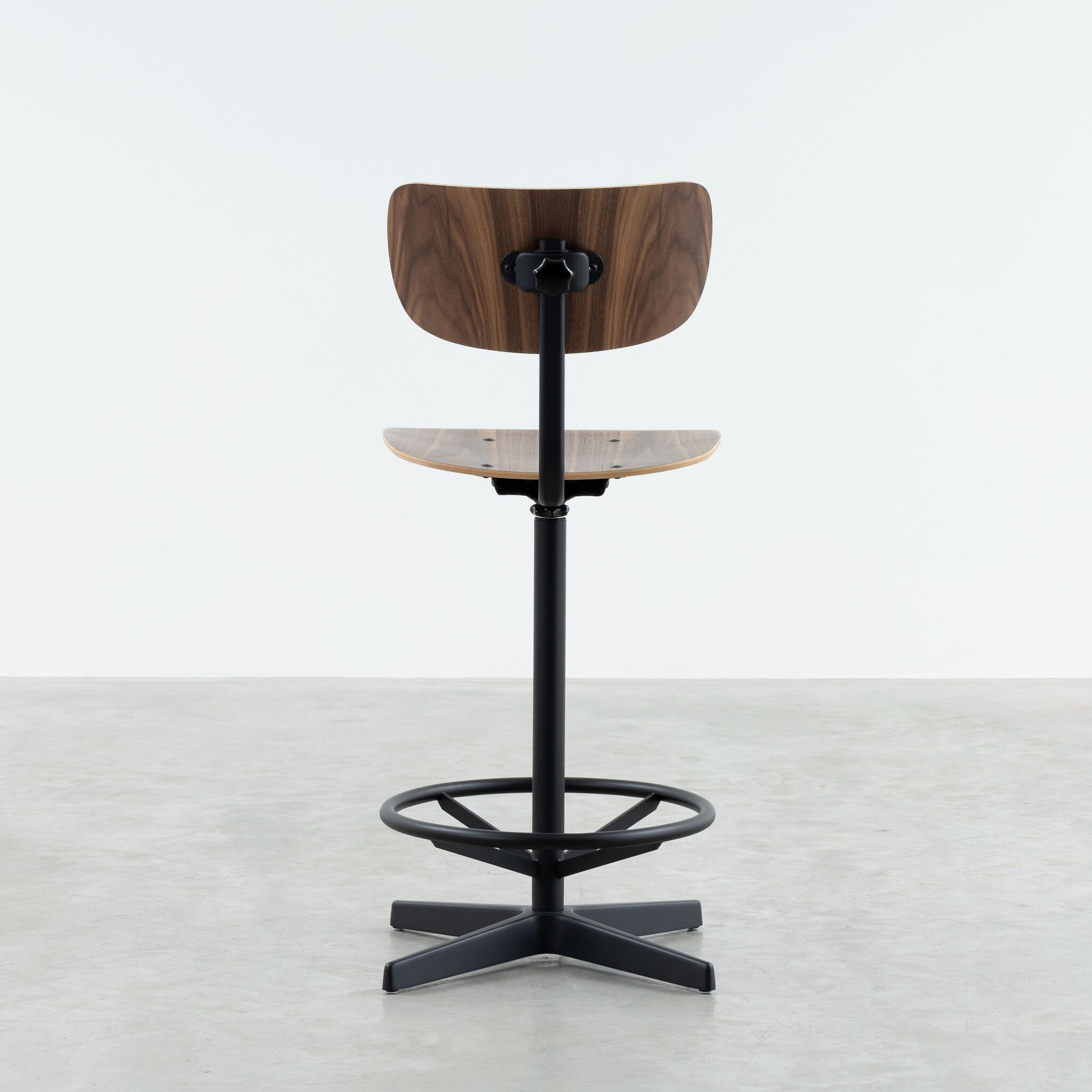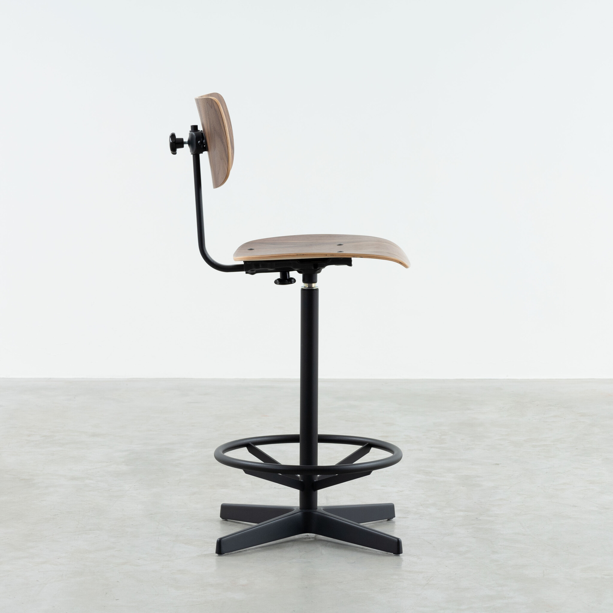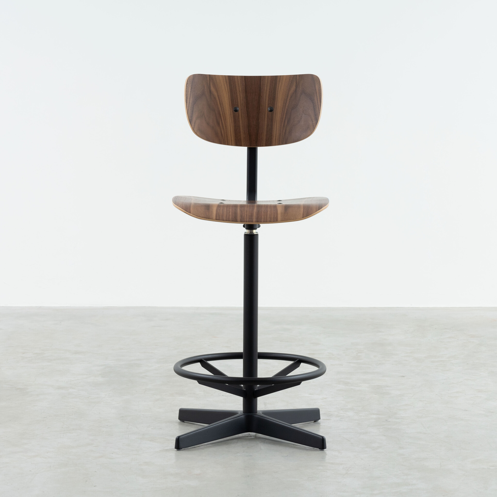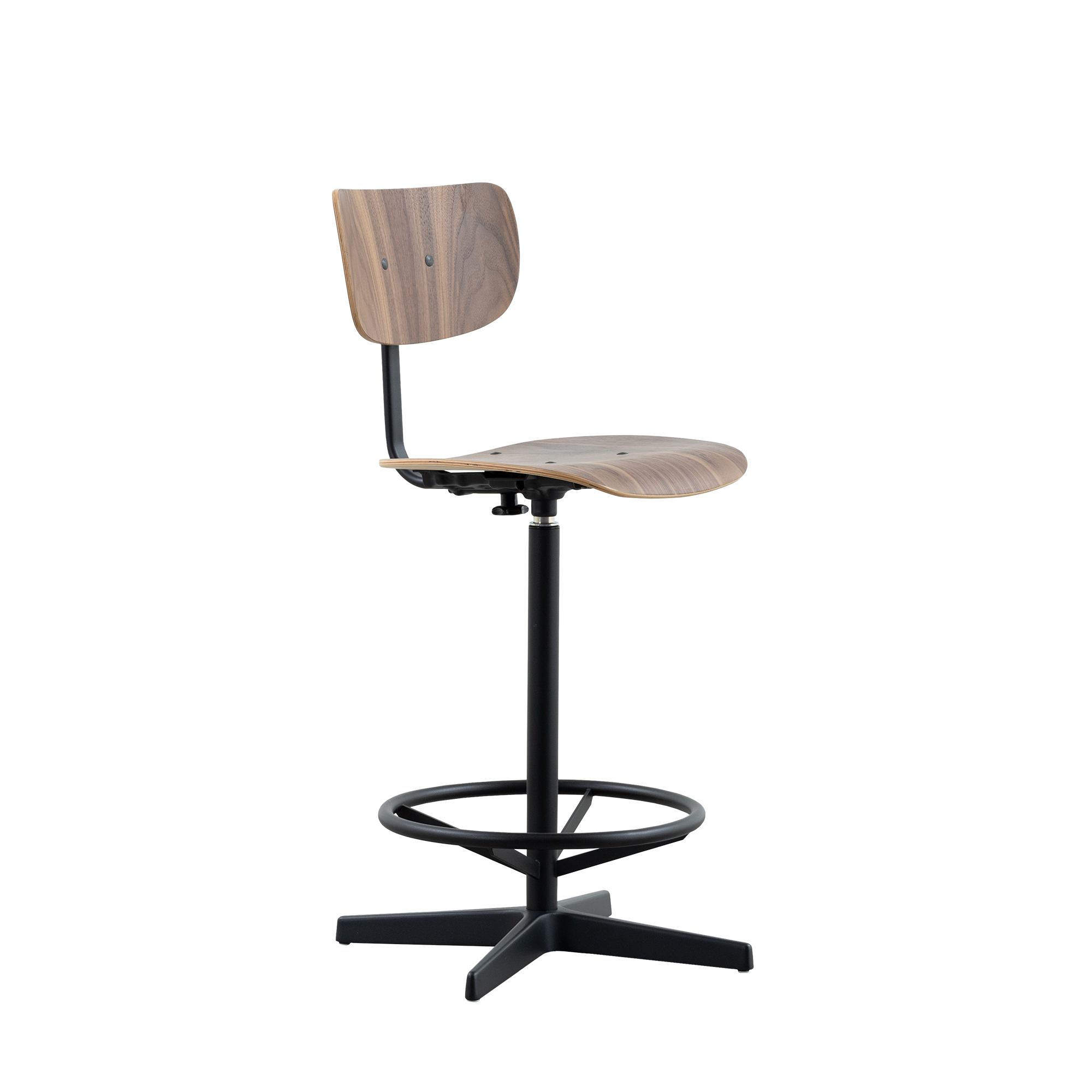 The Jops counter bar chair combines simplicity and functionality in a stylish design suitable for various applications. With a seat and backrest made of bent wood, this chair offers optimal comfort, ideal for extended use. The seat and backrest are available in high-quality real oak or walnut veneer, giving the chair a natural and warm appearance.