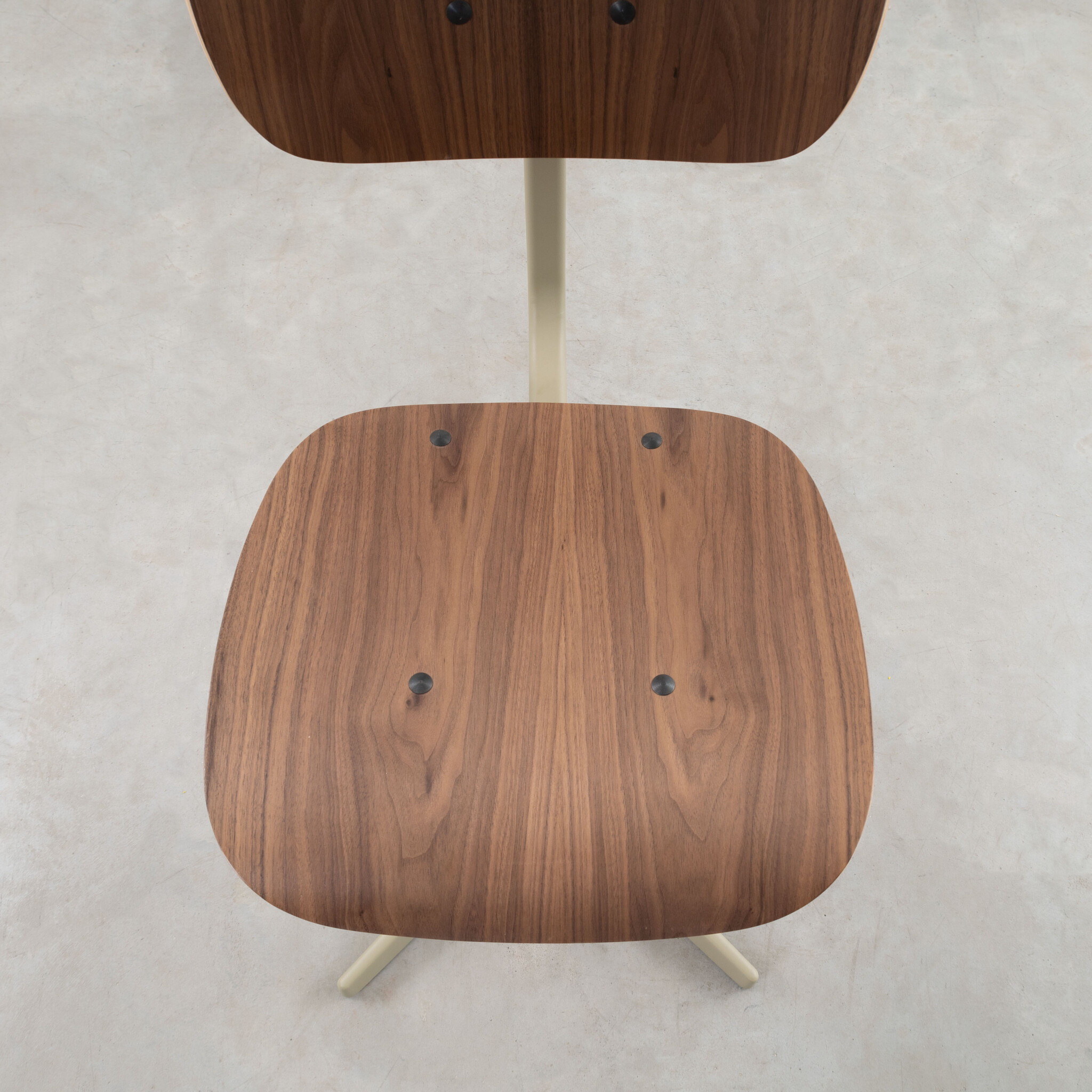 Material: Frame made of folded sheet metal. Backrest & seat made of oak or walnut veneer