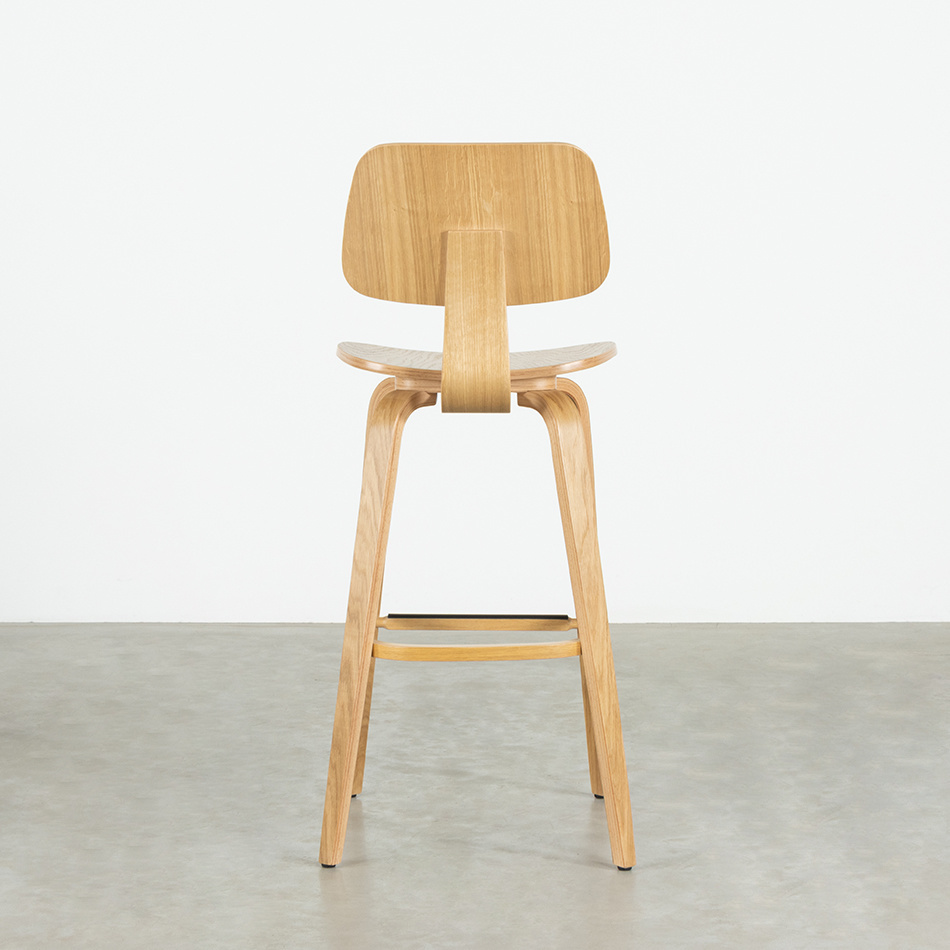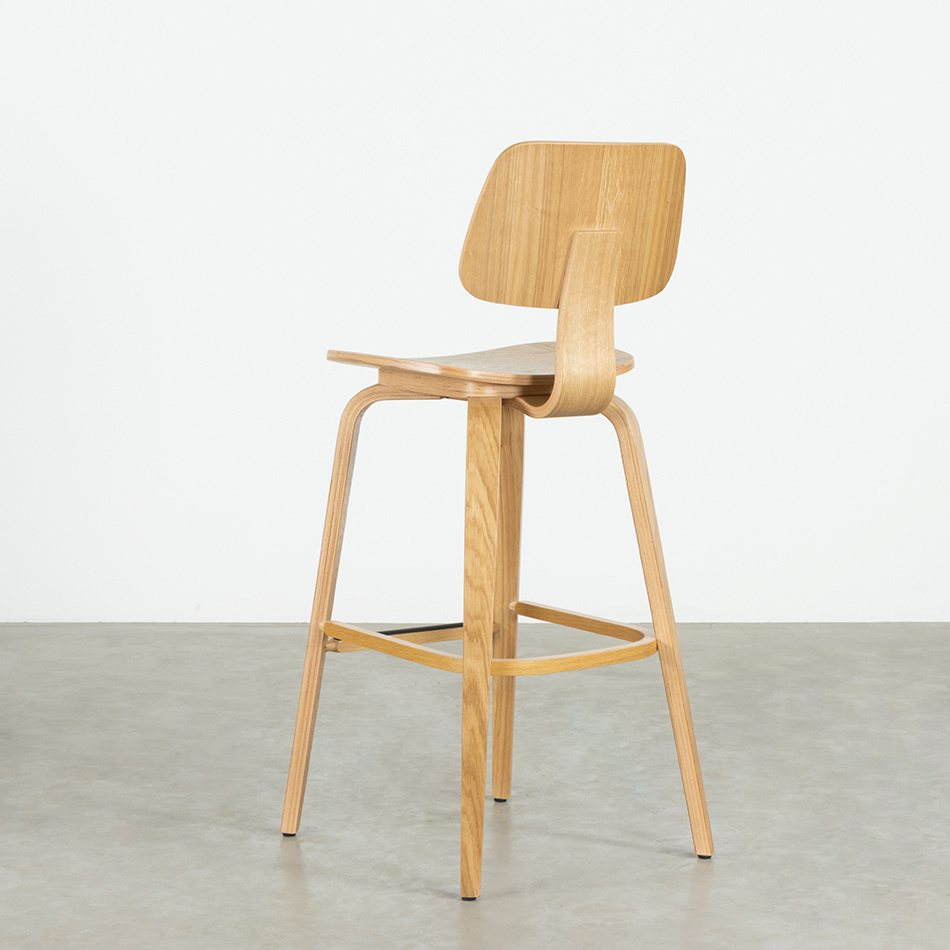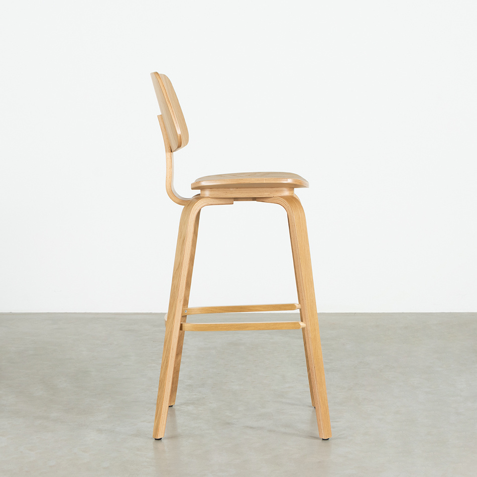 Bar chair Junni is made of plywood with oak veneer, with a matt lacquered finish. The material has the nice property that it is strong and can be bent nicely. You can see the soft curves everywhere in Junni: in the backrest, seat and legs. With seating comfort as a result. With a seat height of 75 cm, this bar chair is ideal for the bar or standing table. At the front of the kitchen island there is the Junni Counter Bar chair (65 cm seat height).