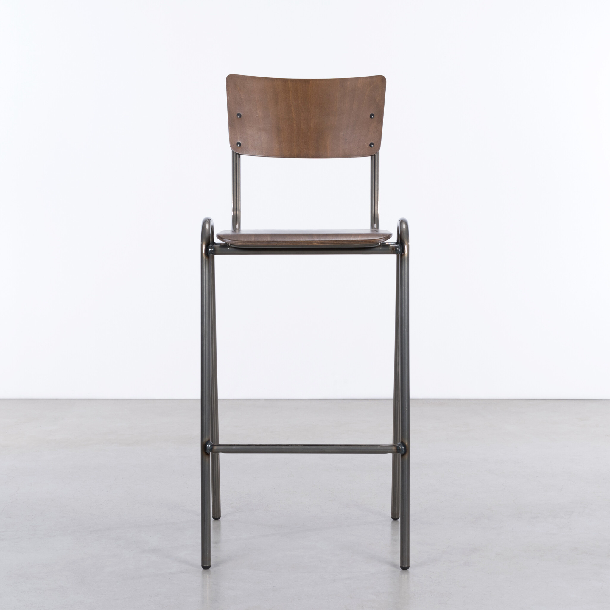 An industrial bar chair made of strong materials. The frame is made of steel and has a protective transparent powder coat layer. The wood of the seat and back is simply processed, which gives a natural effect. You can choose from three stain colours. The leg caps are made of rubber and ensure a good grip. A bar chair that stands firmly on the ground with its legs.