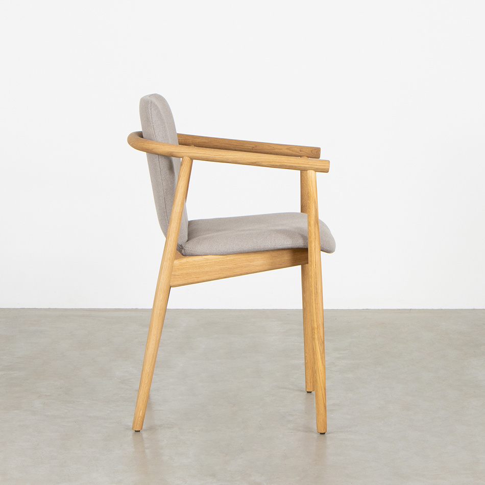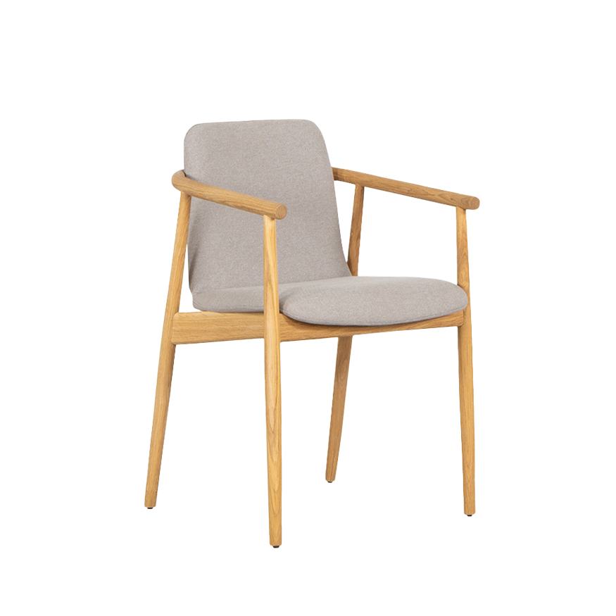 The wooden seat and back from one flowing wooden whole, which is supported by the frame. The frame is a special combination of curved and straight lines. A combination that looks strong and elegant and a joy to sit on. The Mirja is made of solid oak wood. The wood is finished with oil. The chair is available with a wooden or upholstered seat.