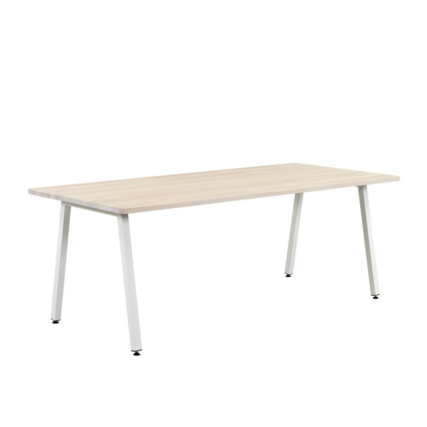The MK Table is a special dining table with a white or black metal base and a solid wood top. You can choose from solid oak or walnut wood. The solid wood is smoothly and softly finished, giving it a light appearance. With the same design language as the MK Chair, this table has a sleek, angular steel frame that contrasts with the slightly rounded corners of the tabletop. This interplay of shapes creates a balanced and modern look.