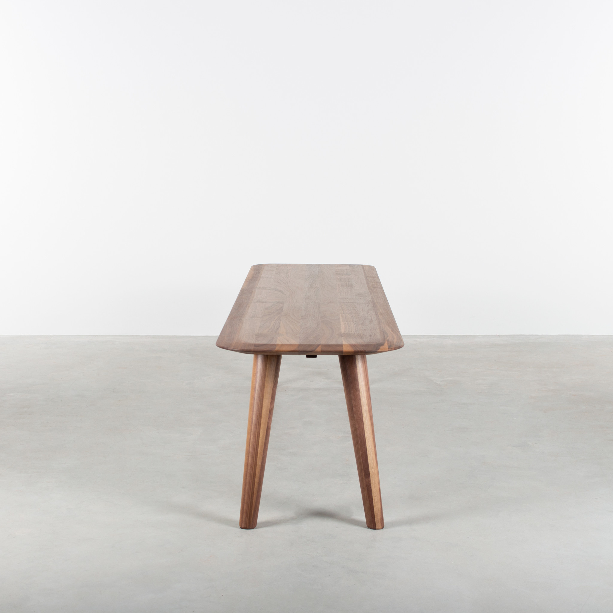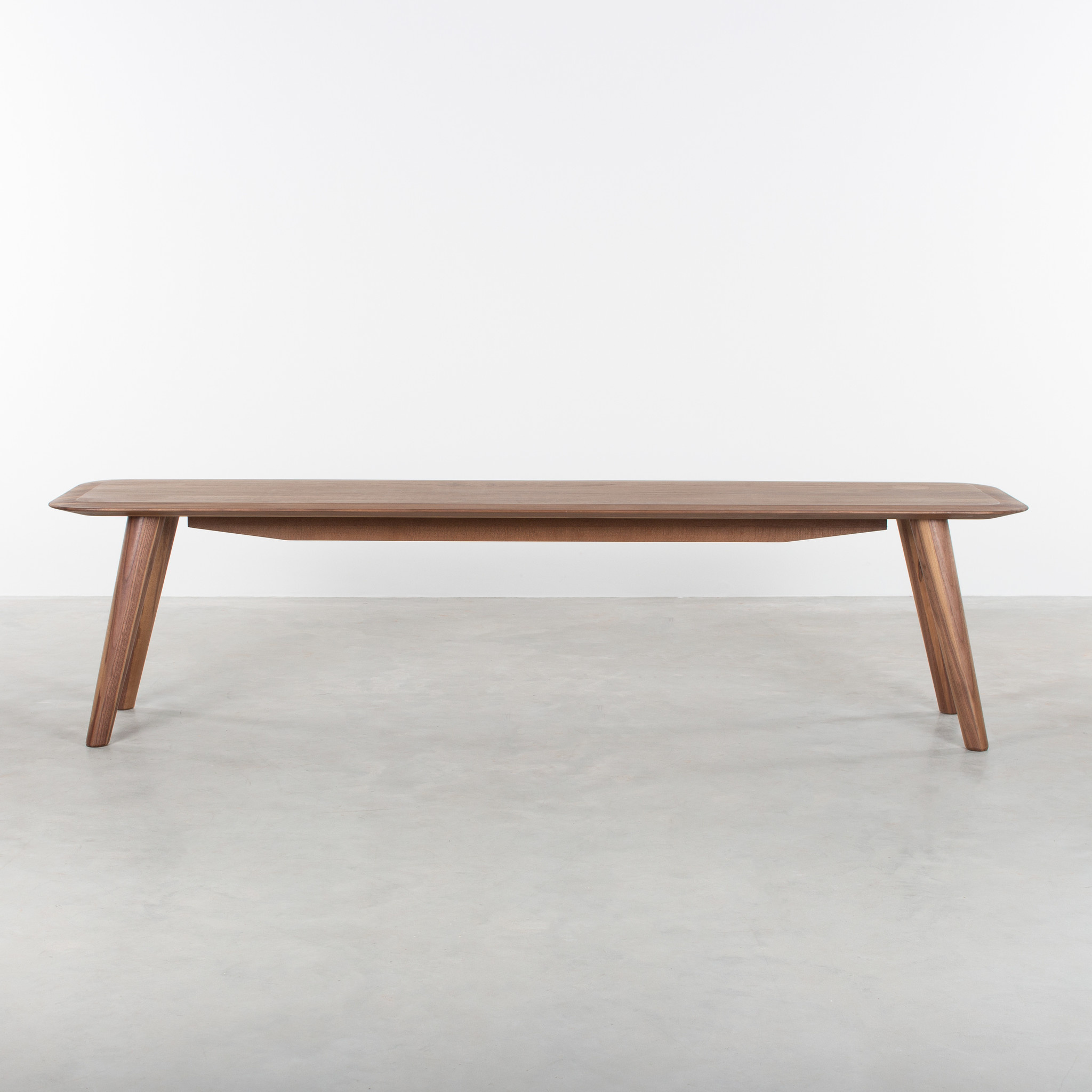 The Olger dining table bench is made of solid wood and has a slender shape and round corners. The dining table bench has the same design as the Olger dining table. Together they form a perfect duo. The most striking detail are the legs that extend into the top. The legs protrude, as it were, through the top and, just like the top, have a nice flat finish. Special to see and beautifully executed.