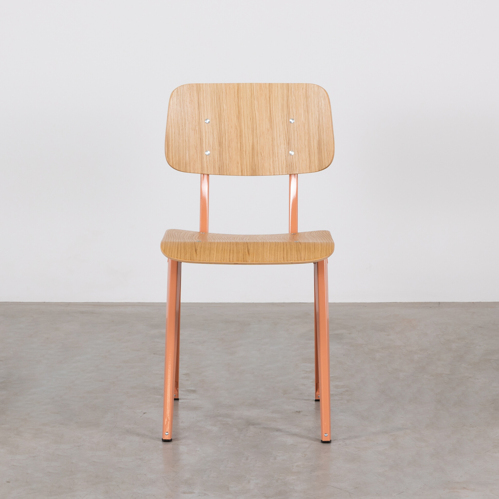 Material: Frame made of folded sheet steel. Backrest and seat made of lacquered oak veneer.
