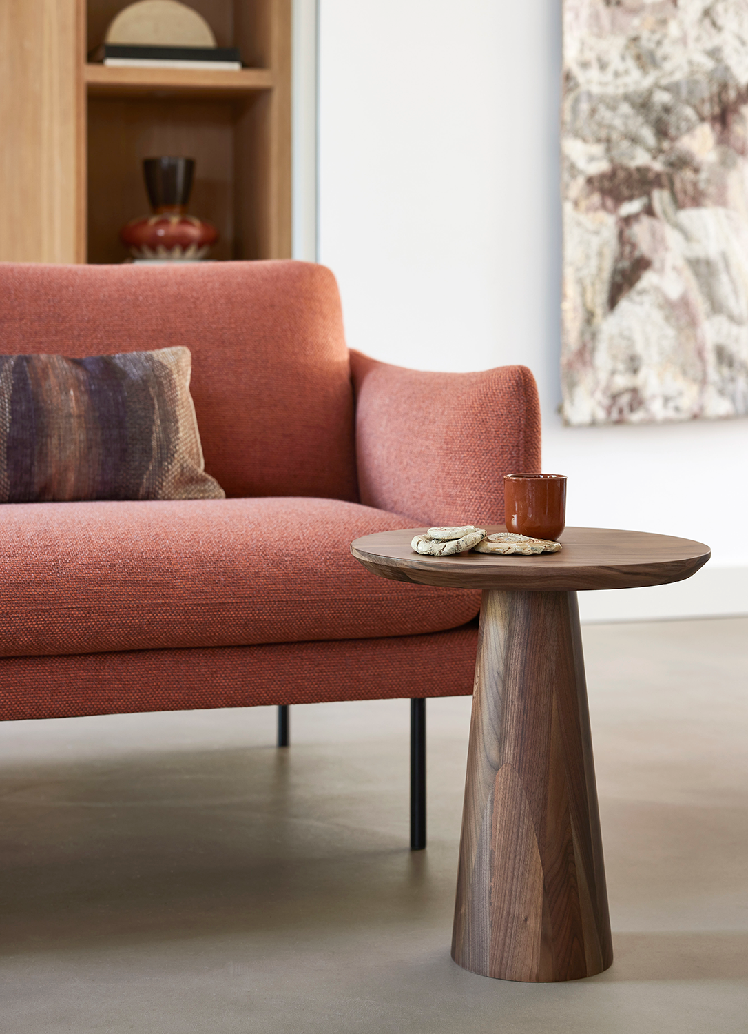 In Danish, "sød" means sweet. The Sød design side table is a striking round side table with a sleek, tapered leg – an elegant addition next to your sofa. Perfect for your glass, coffee cup, or book. Despite its compact size, this Scandinavian side table stands out without taking up too much space. Made from solid wood and available in beech, oak, or walnut, this stylish side table fits effortlessly into any interior.