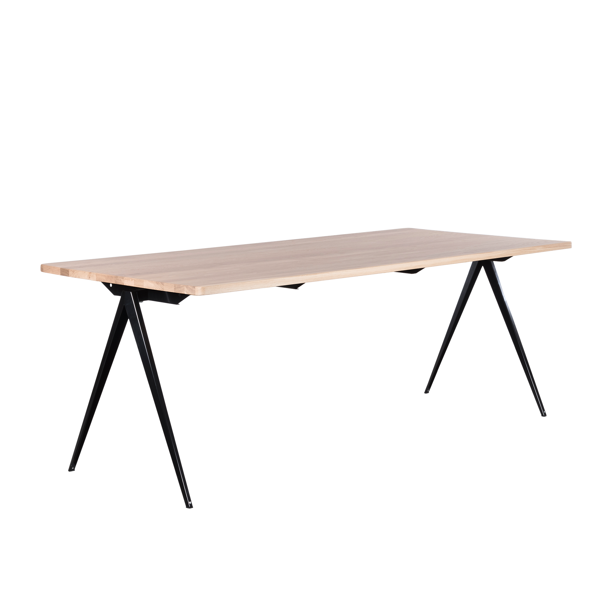 The TD4 table is inspired by the steel school desks of the 1960s. In this version, it works perfectly as a desk. The metal frame and the solid wood top give the design a clear, functional look. The proportions and construction match the original design. You can see this in the clean lines and the characteristic compass-shaped legs. The design looks simple but is full of well-thought-out details.