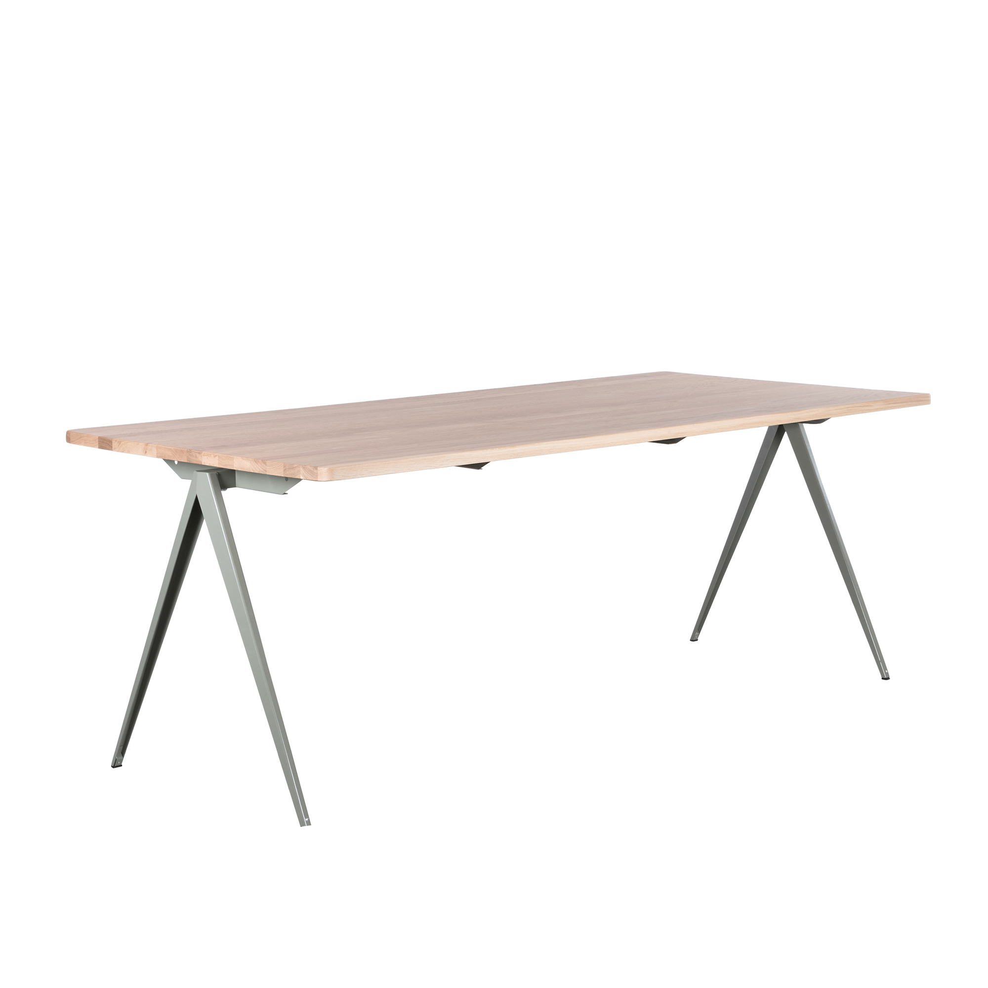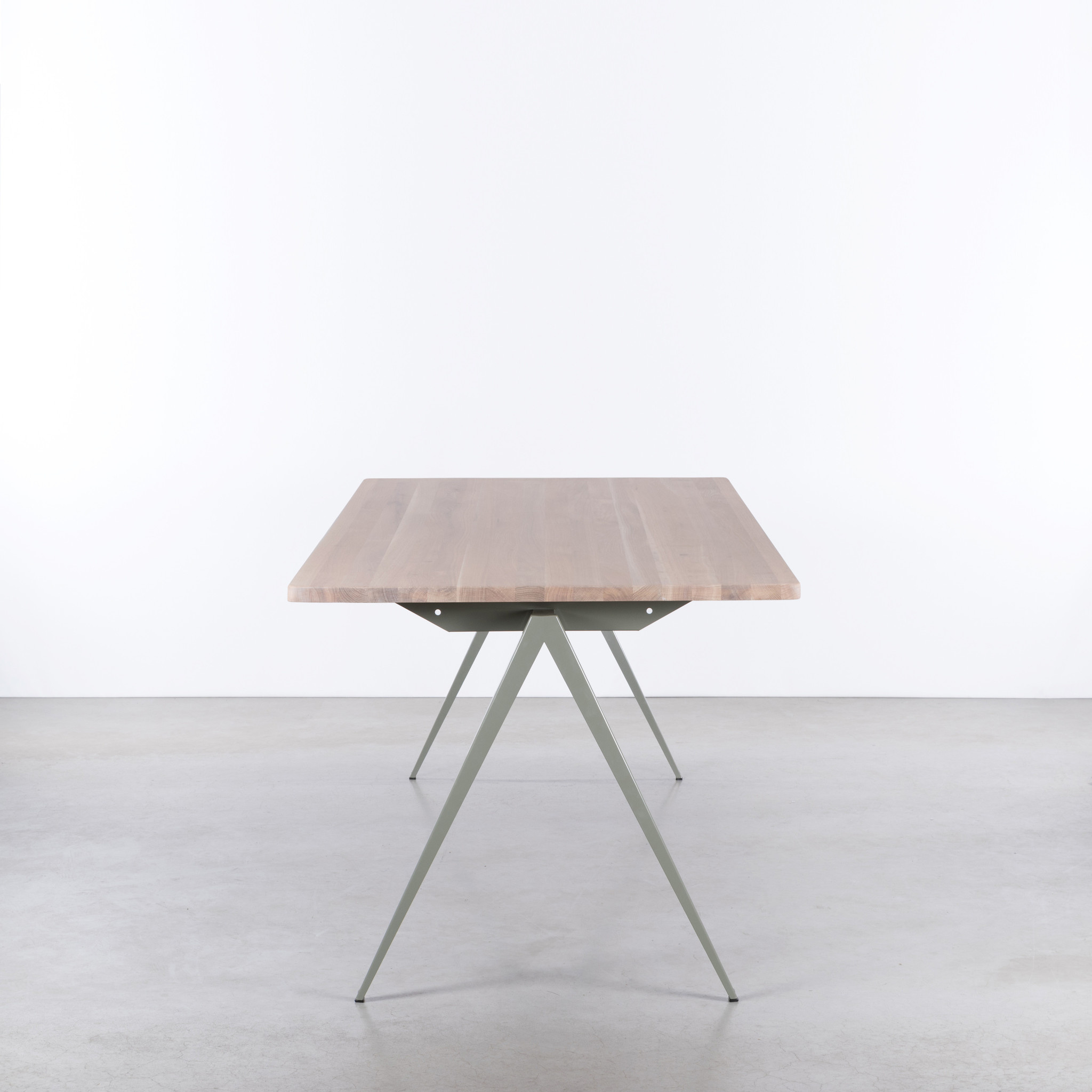 The tabletop is made of solid wood and is available in beech, oak, or walnut. The wood is smoothly finished and feels pleasant while working. This desk fits a wide range of interior styles. In an industrial interior, the design stands out, but it also works well in a modern or calm setting. Combine it with the Galvanitas S16 chair for a strong workspace with character.