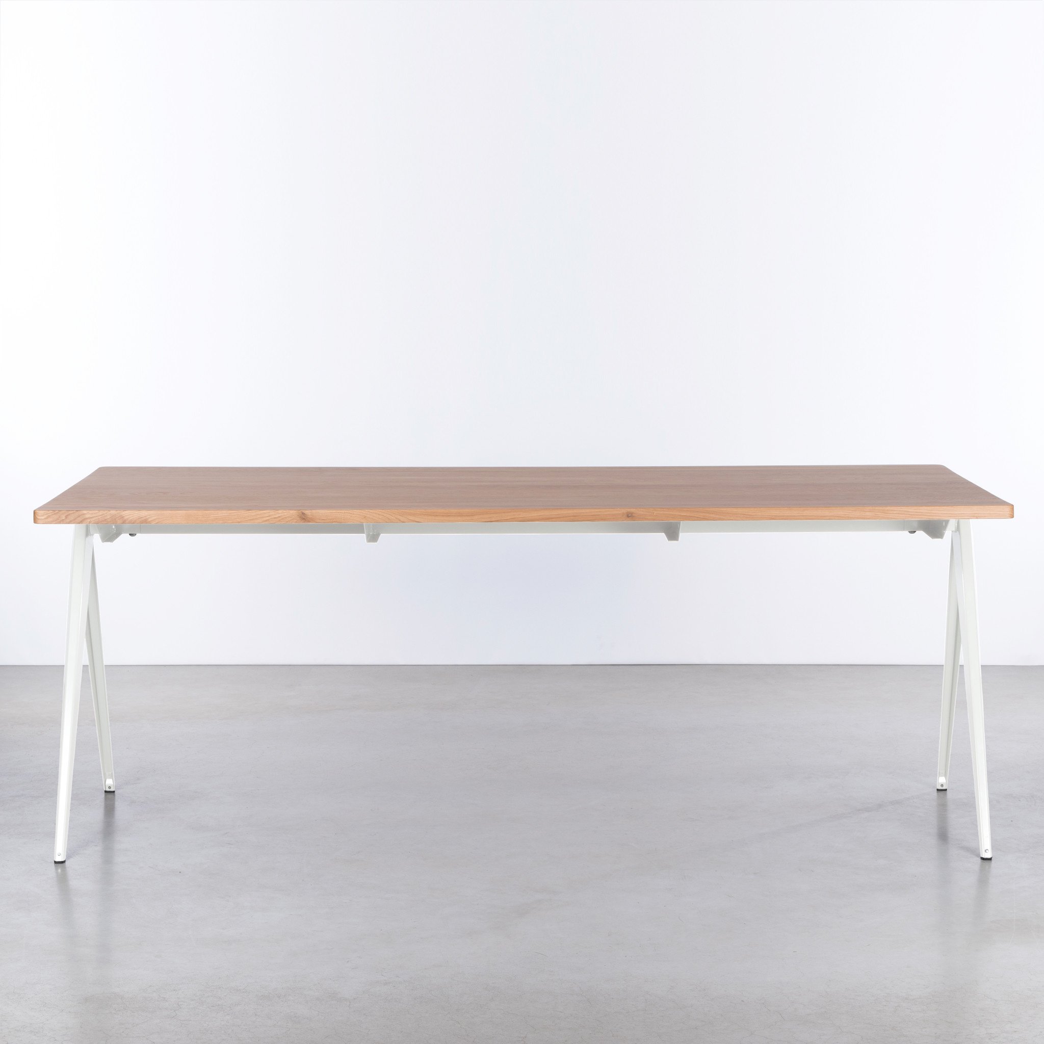 The top of the TD4 table is made of solid wood. You can choose from beech, oak or walnut. The solid wood has a smooth and soft finish, giving it a light appearance. A table that fits in different styles The table fits well in the current interior styles. With its seemingly simple design, its light appearance and good quality, it is a table that goes well with different interior styles. With its industrial origin, the TD4 table fits well in an industrial interior. The industrial school chair Galvanitas S16 looks beautiful. Both with the characteristic compass-shaped legs, they make a great dining room set.