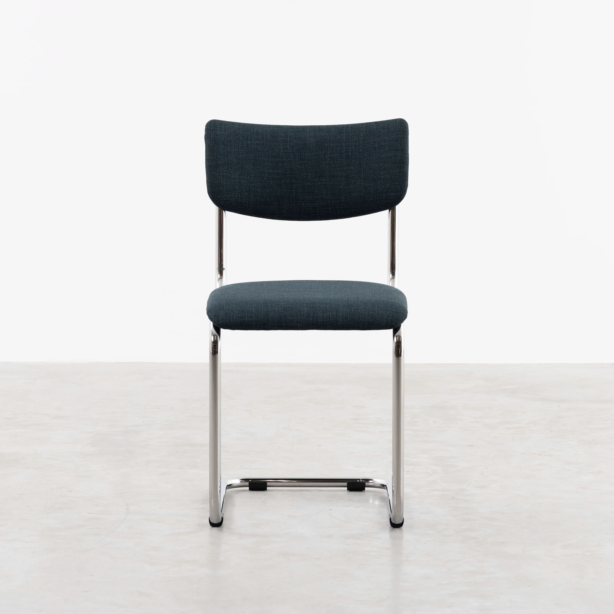 The Dykmeyer De Purmer is a tubular frame cantilever chair. Inspired by the Avant Garde chairs from the 1930s. The chair has a modern industrial look. With a good seat, it is an ideal dining room chair. The tubular frame has right angles and runs parallel to each other from the carriage to the backrest. Due to the kink in the tubular frame, the backrest is slightly tilted. This provides the right support for a delicious meal. The Bakelite armrests ensure that your arms also receive support. With its solid quality, the De Dykmeyer Purmer is suitable for catering, business and private use.
