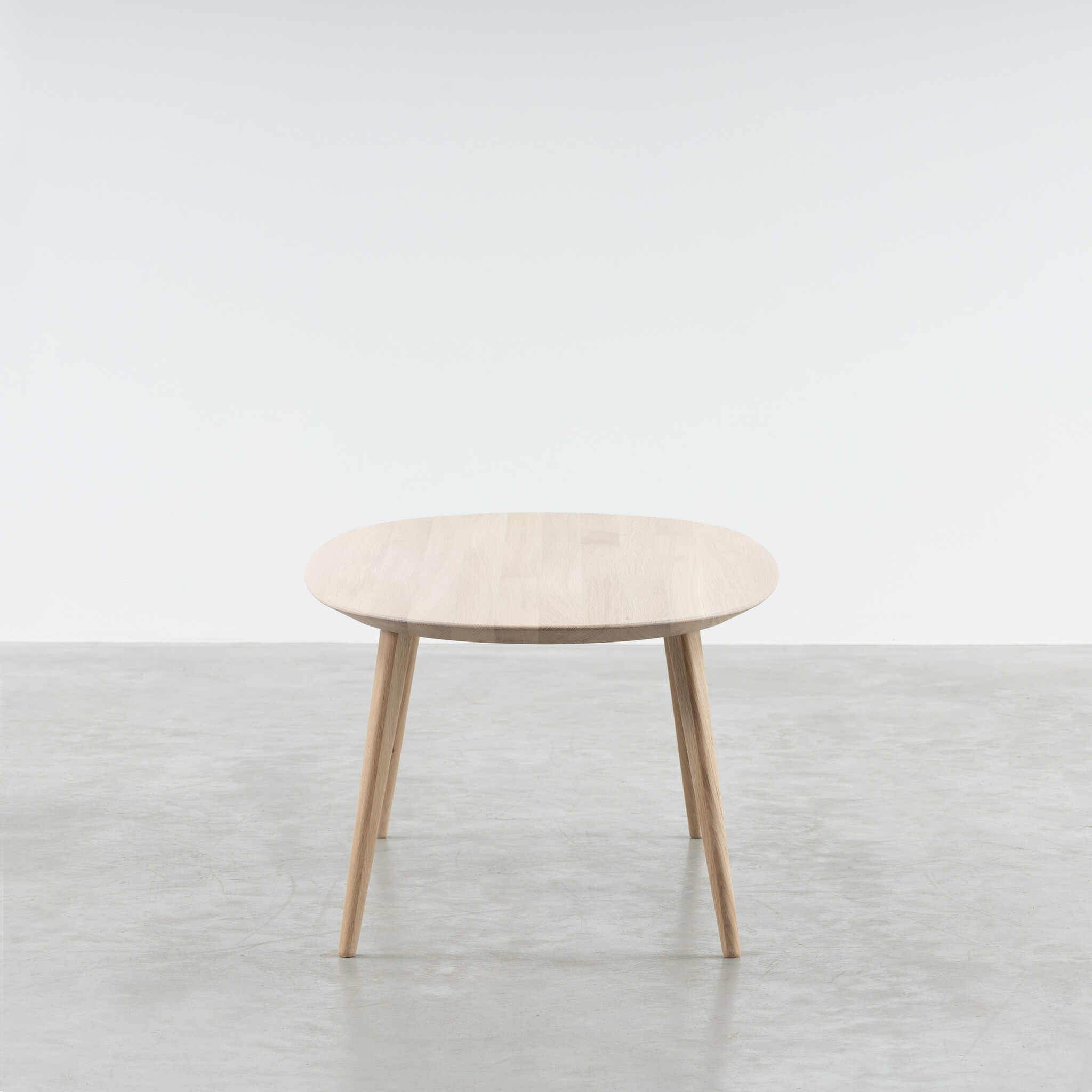 The oval Tomrer coffee table features a slender construction and a floating tabletop, giving it a light and soft appearance. The edges are tapered, and the flowing lines of the design make the table inviting to the touch. The four legs are slightly angled under the tabletop and have rounded corners.