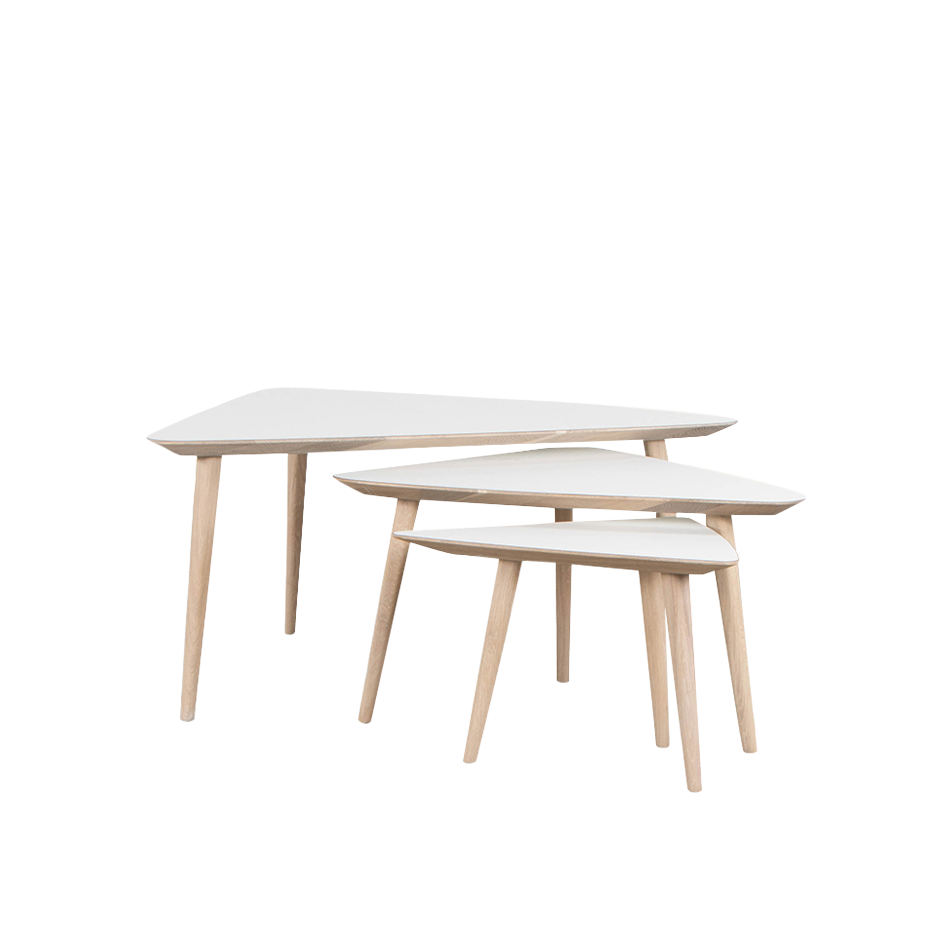 The Tomrer coffee table comes from the Sav & Økse collection. A collection of Scandinavian tables made of solid wood. Characteristic in their simplicity and quality. This is clearly reflected in the Tomrer coffee table. A table with a slender construction and a free lying top. This makes the table look light and soft. The edges are rejuvenated and the flowing lines of the design make the table cuddly. The legs are slightly slanted under the table-top and have rounded corners. Both the triangular and the round variant have three legs.