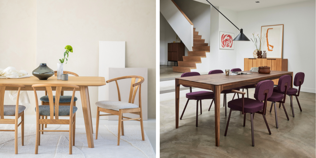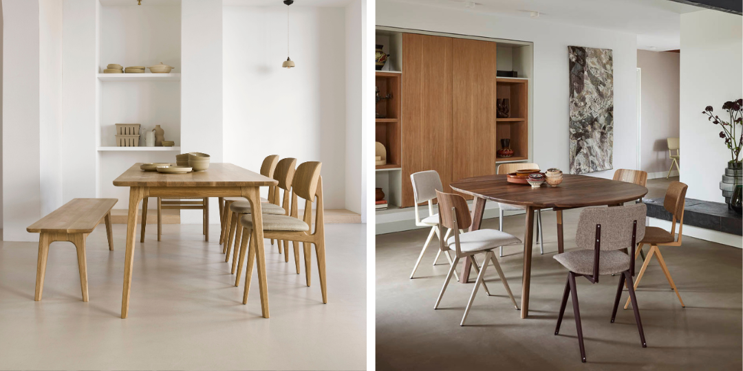 Naast de afmetingen speelt ook de vorm een belangrijke rol. Binnen de collectie van De Machinekamer vind je verschillende vormen eettafels. Elke vorm heeft invloed op hoeveel stoelen er passen en hoe de tafel in de ruimte staat.