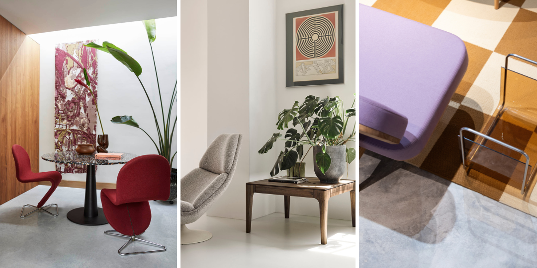 Foto 1: Verner Panton stoelen Fritz Hansen, foto 2: Artifort relaxfauteuil en salontafel Rikke, foto 3: Bank Olger en bijzettafel Hubsch.