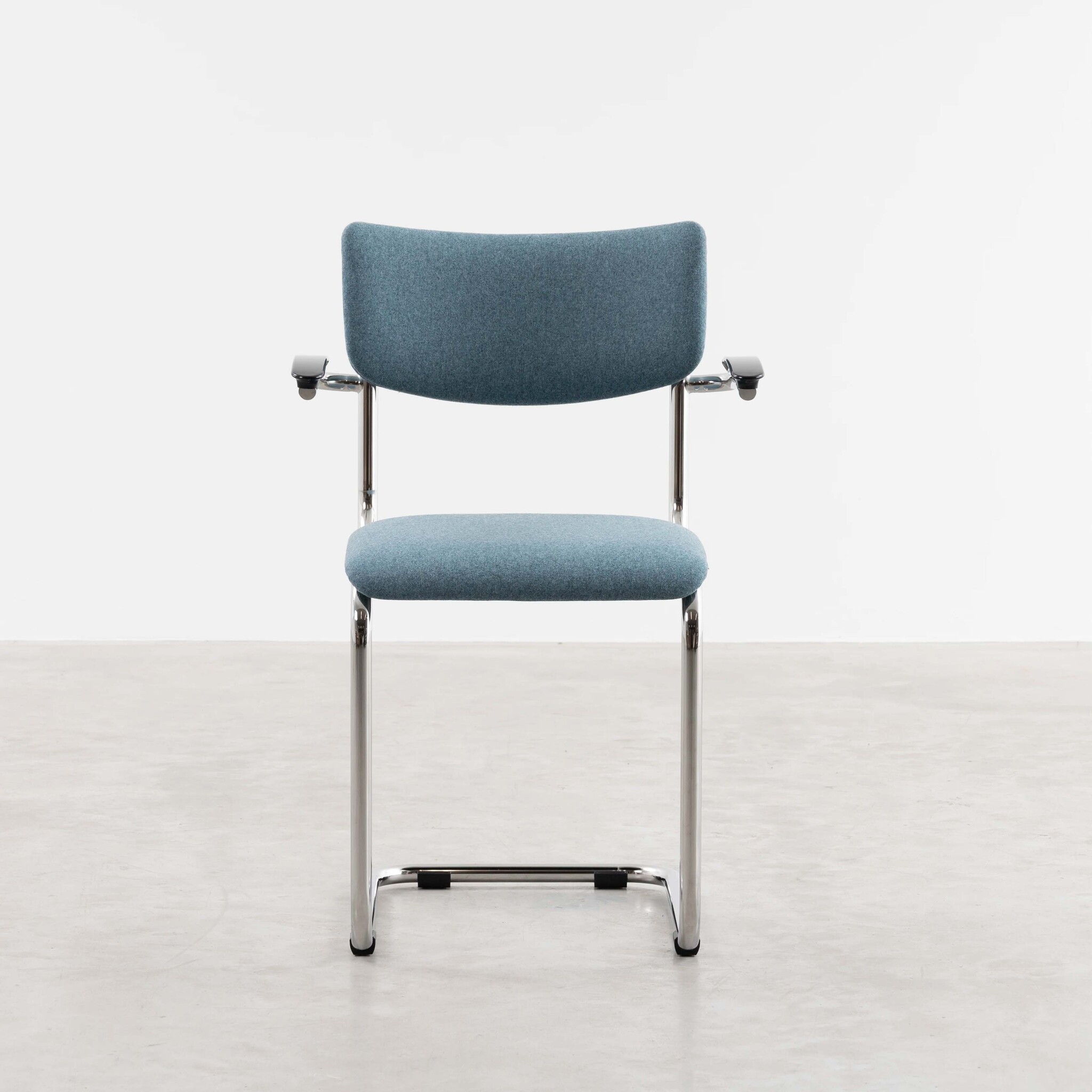 De Purmer is een buisframe sledestoel. Geïnspireerd op de Avant Garde stoelen uit de jaren ’30. De stoel heeft een moderne industriële uitstraling. Met daarbij een goede zit, is het een ideale eetkamerstoel. Het buisframe frame heeft rechte hoeken en loopt van de slede tot en met de rugleuning evenwijdig aan elkaar. Door de knik in het buisframe staat de rugleuning licht gekanteld. Dit geeft de juiste ondersteuning om heerlijk te tafelen. De bakelieten armleuningen zorgen ervoor dat ook je armen ondersteuning krijgen. Met zijn degelijke kwaliteit is De Purmer geschikt voor zowel horeca, zakelijk als particulier gebruik.
