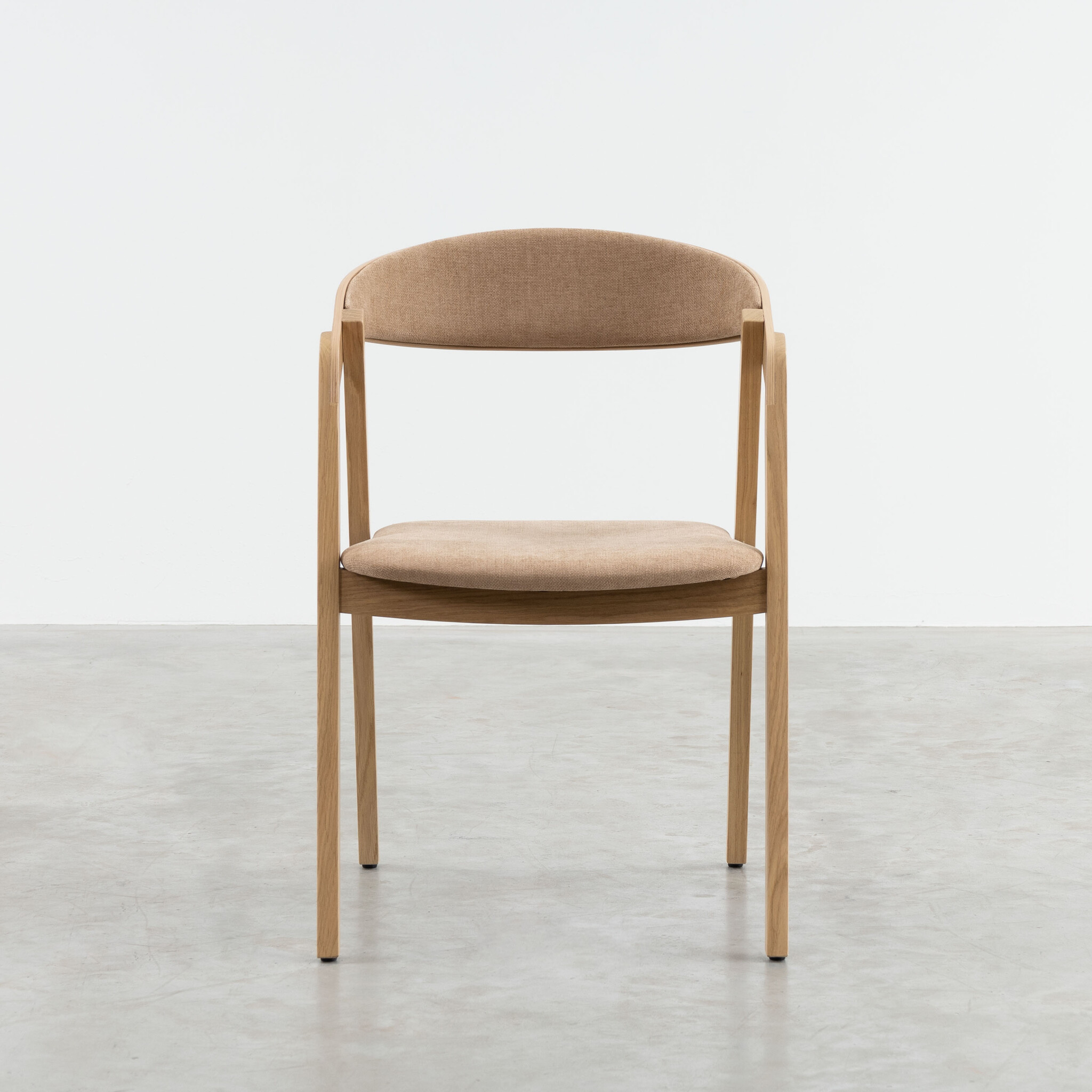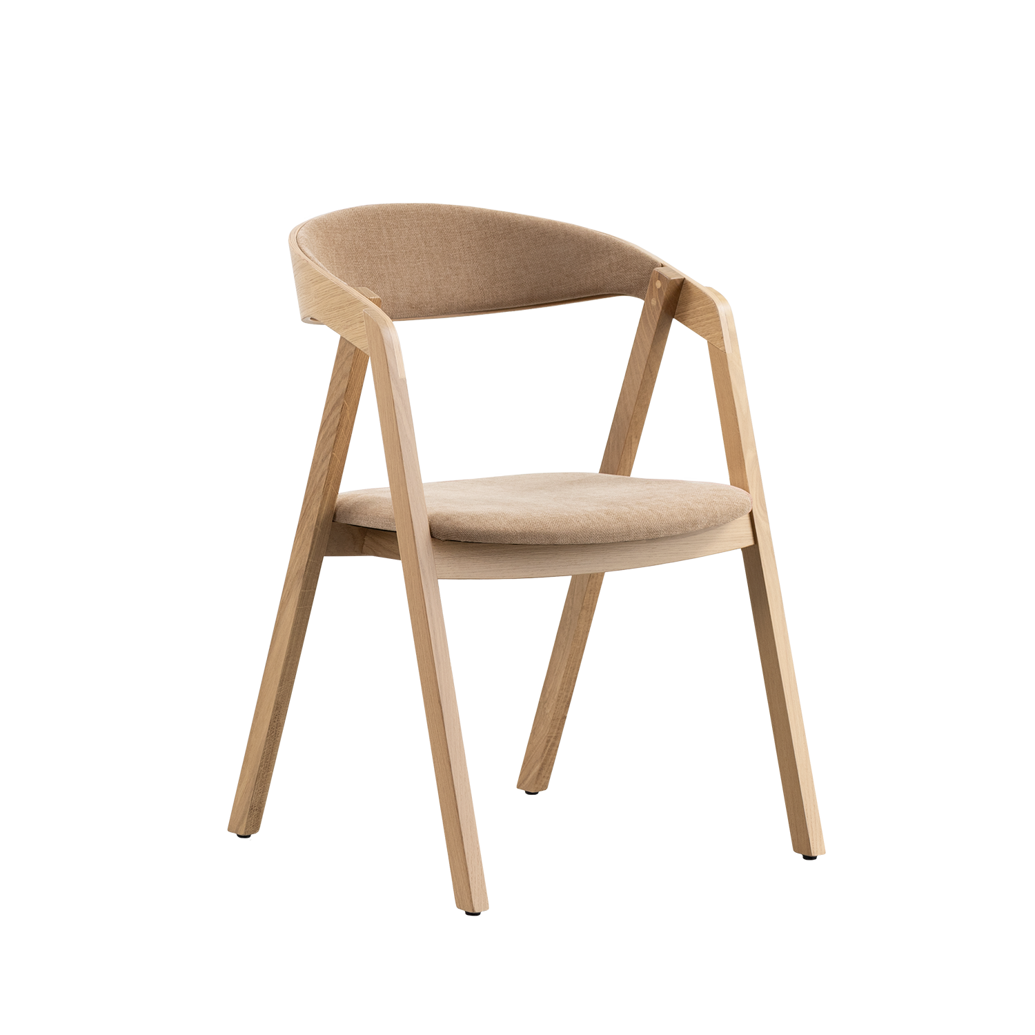 De Edske met gestoffeerde rug en zitting is verkrijgbaar in eiken mat gelakt en beuken walnoot gekleurd in verschillende kleuren Olympus stof.