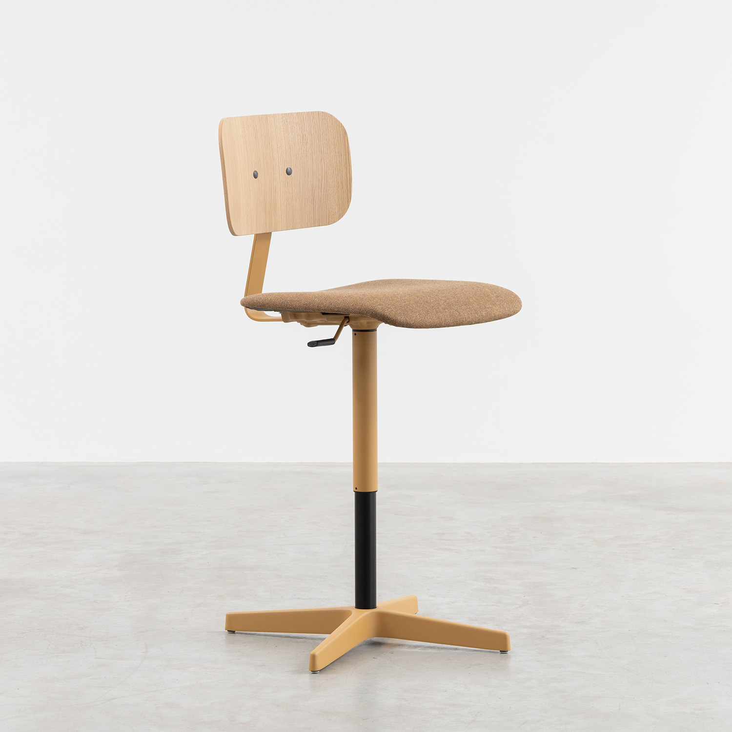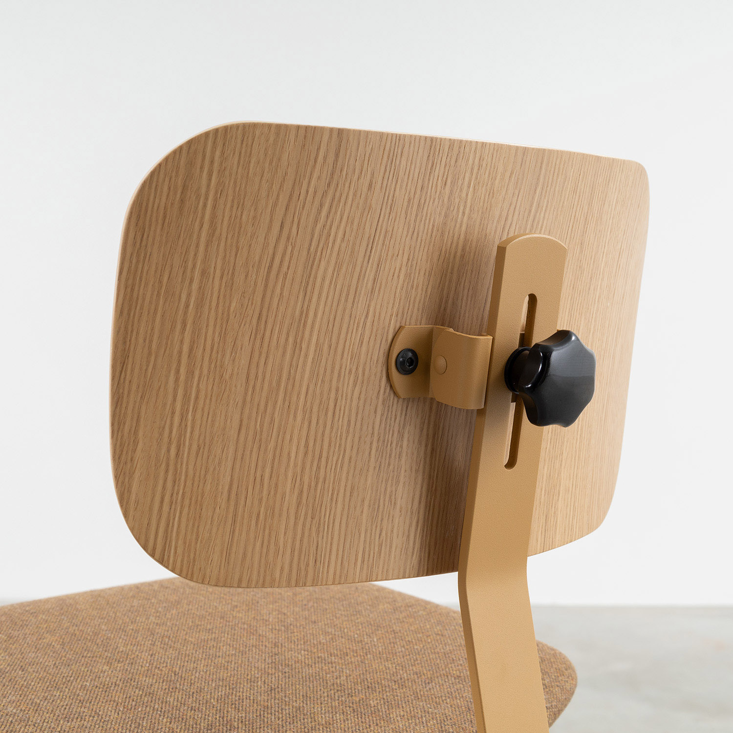 De rugleuning is uitgevoerd in eikenfineer, de zitting is gestoffeerd. Beide onderdelen zijn ook volledig verkrijgbaar in eiken- of walnotenhoutfineer.