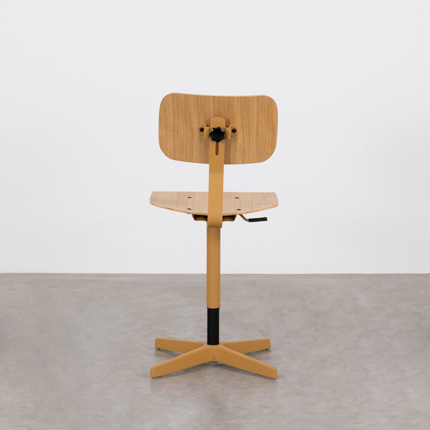Niet te missen is het frame, dat beschikbaar is in 5 verschillende gepoedercoate kleuren. Of je nu kiest voor een grafietzwarte afwerking, bruinbeige, muisgrijs, grijsbeige of een lichtivoor, deze werkstoel past naadloos bij elke stijl en smaak. De zitting en rugleuning zijn mogelijk in een fineer van eikenhout of walnotenhout.