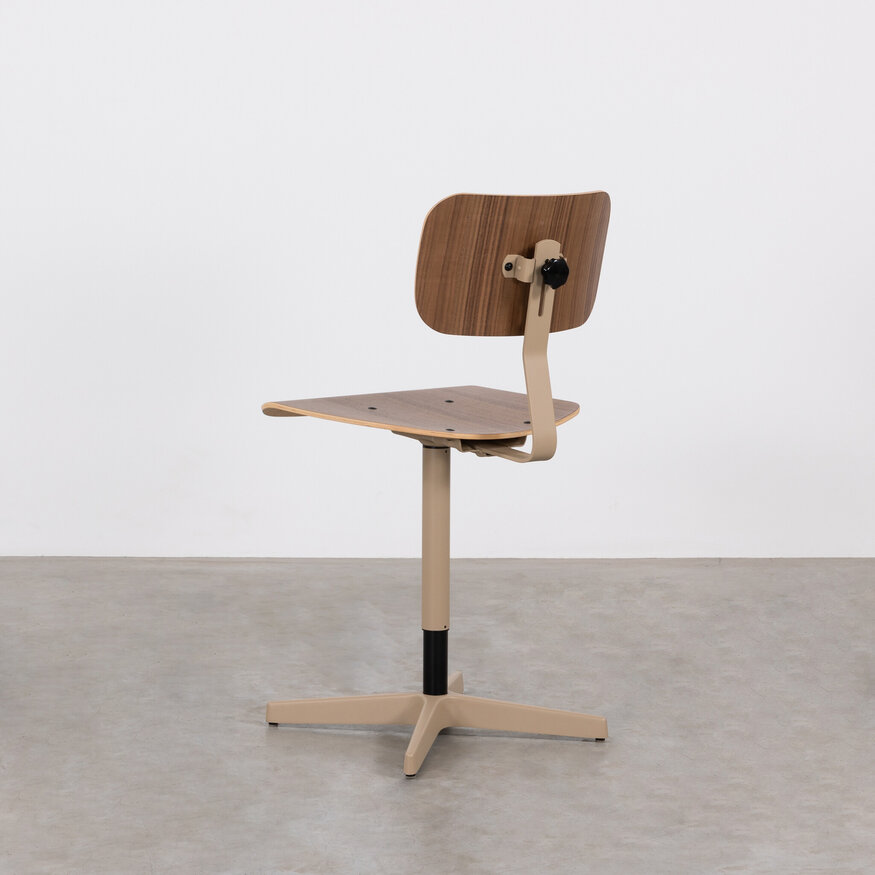 Niet te missen is het frame, dat beschikbaar is in 5 verschillende gepoedercoate kleuren. Of je nu kiest voor een grafietzwarte afwerking, bruinbeige, muisgrijs, grijsbeige of een lichtivoor, deze werkstoel past naadloos bij elke stijl en smaak. De zitting en rugleuning zijn mogelijk in een fineer van eikenhout of walnotenhout.