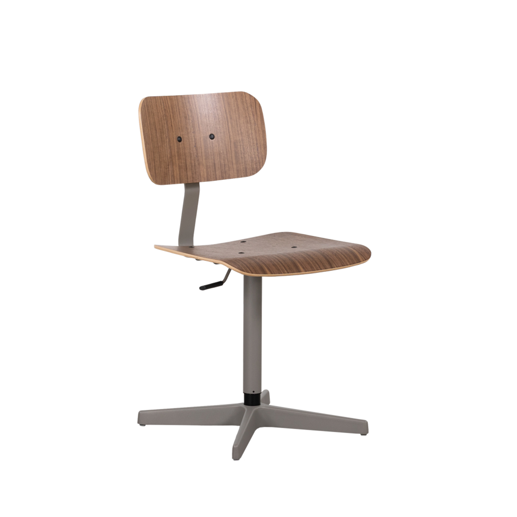Niet te missen is het frame, dat beschikbaar is in 5 verschillende gepoedercoate kleuren. Of je nu kiest voor een grafietzwarte afwerking, bruinbeige, muisgrijs, grijsbeige of een lichtivoor, deze werkstoel past naadloos bij elke stijl en smaak. De zitting en rugleuning zijn mogelijk in een fineer van eikenhout of walnotenhout.