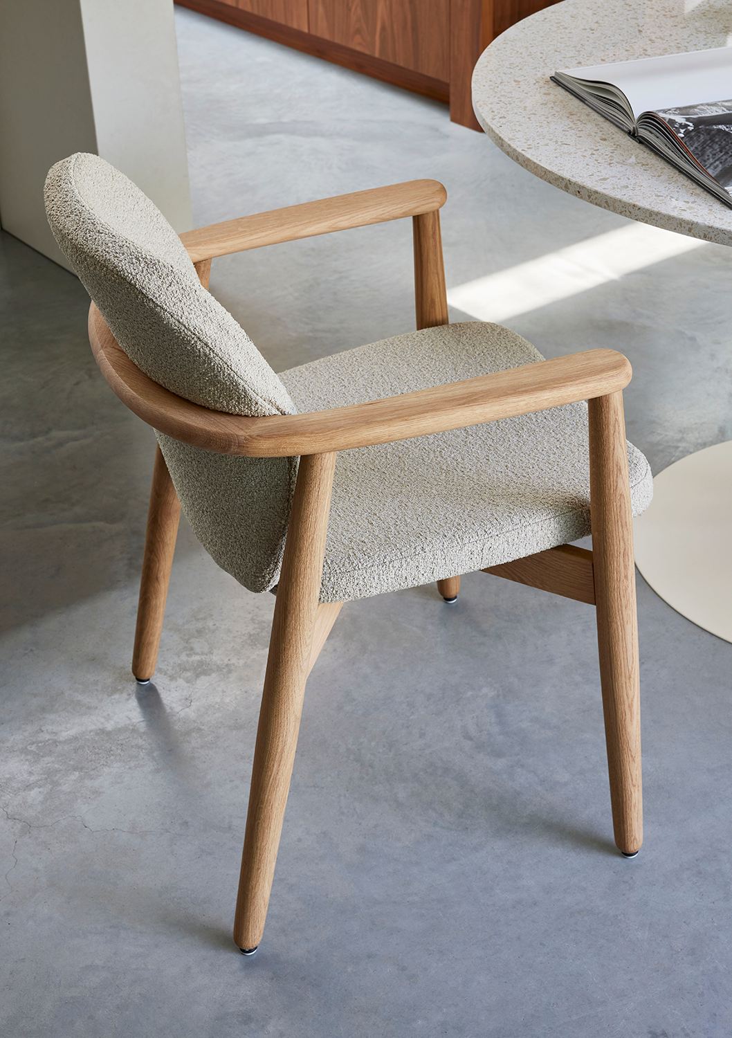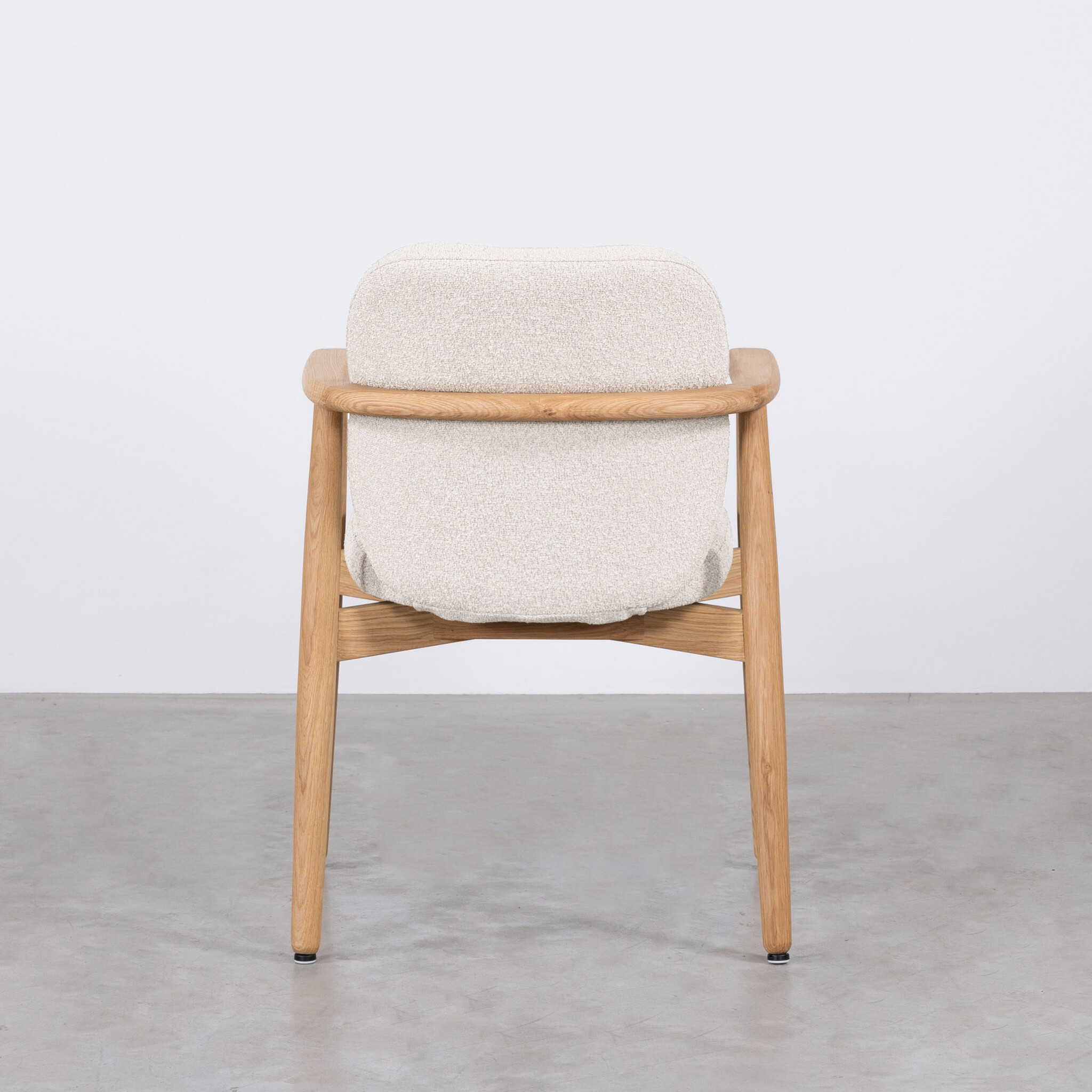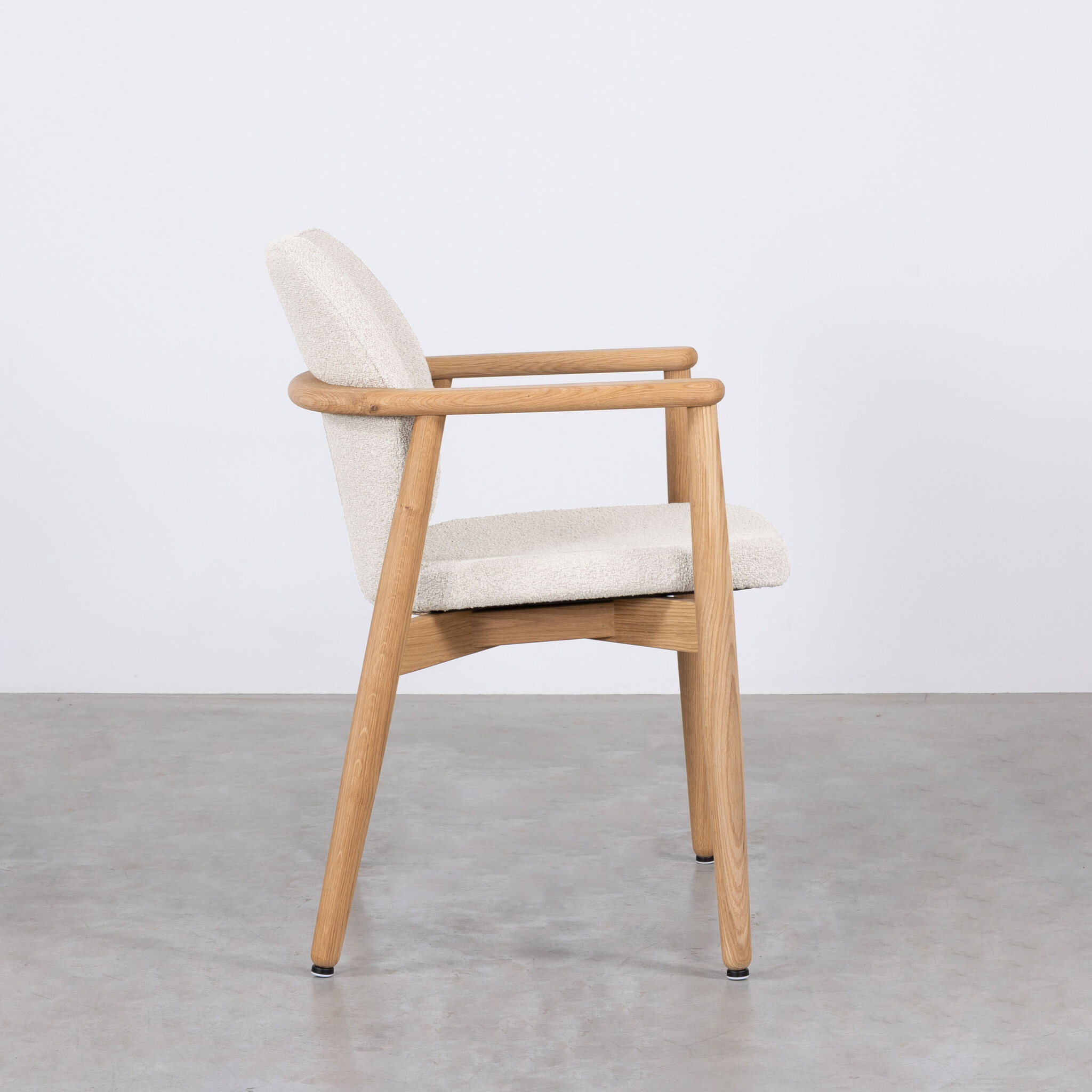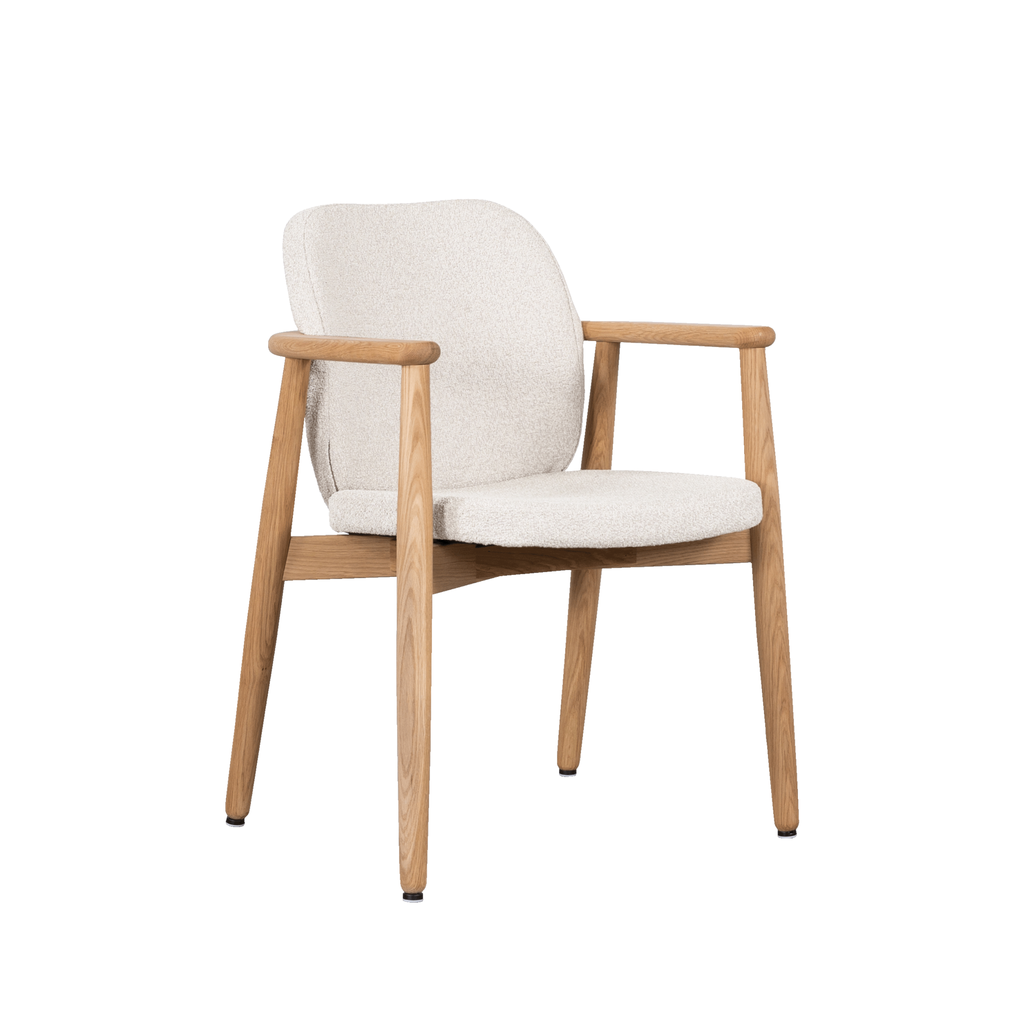 Eetkamerstoel Kaisa valt op door haar verfijnde details en uitgekiende proporties. De ronde armleuningen en de naadloze overgang naar de rugleuning geven de stoel een vloeiende en elegante uitstraling. Het massief eikenhouten frame is zorgvuldig afgewerkt met een olie, wat de natuurlijke schoonheid van het hout benadrukt. Kaisa is een stevige stoel en biedt veel zitcomfort dankzij de gestoffeerde zitting en rugleuning. De gestoffeerde zitting en rugleuning is leverbaar in verschillende stofsoorten en kleuren, zodat je kunt kiezen wat het beste bij jouw interieurstijl past.