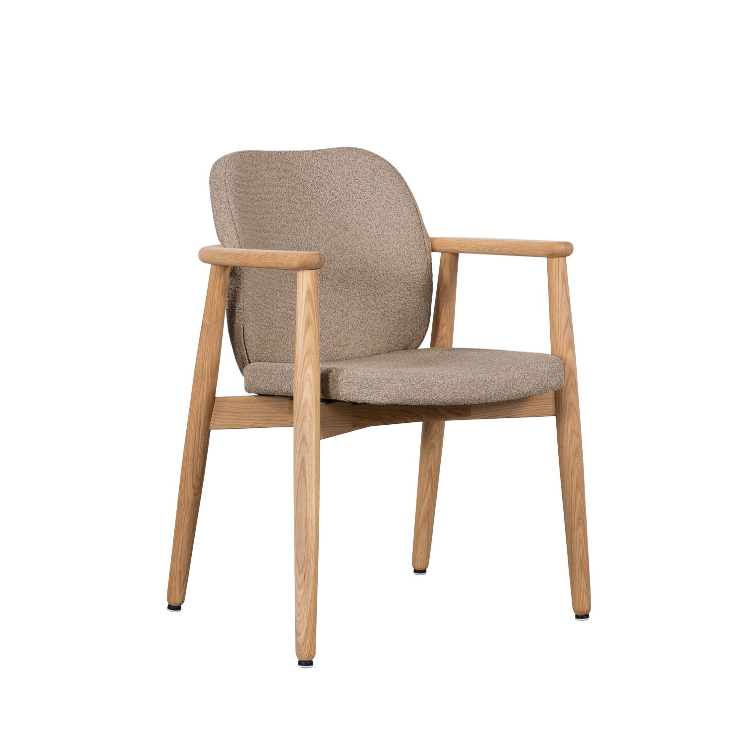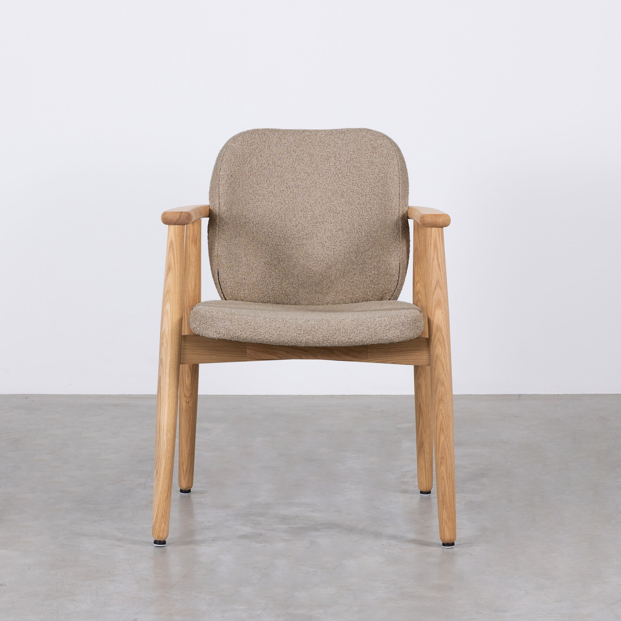 Eetkamerstoel Kaisa valt op door haar verfijnde details en uitgekiende proporties. De ronde armleuningen en de naadloze overgang naar de rugleuning geven de stoel een vloeiende en elegante uitstraling. Het massief eikenhouten frame is zorgvuldig afgewerkt met een olie, wat de natuurlijke schoonheid van het hout benadrukt. Kaisa is een stevige stoel en biedt veel zitcomfort dankzij de gestoffeerde zitting en rugleuning. De gestoffeerde zitting en rugleuning is leverbaar in verschillende stofsoorten en kleuren, zodat je kunt kiezen wat het beste bij jouw interieurstijl past.