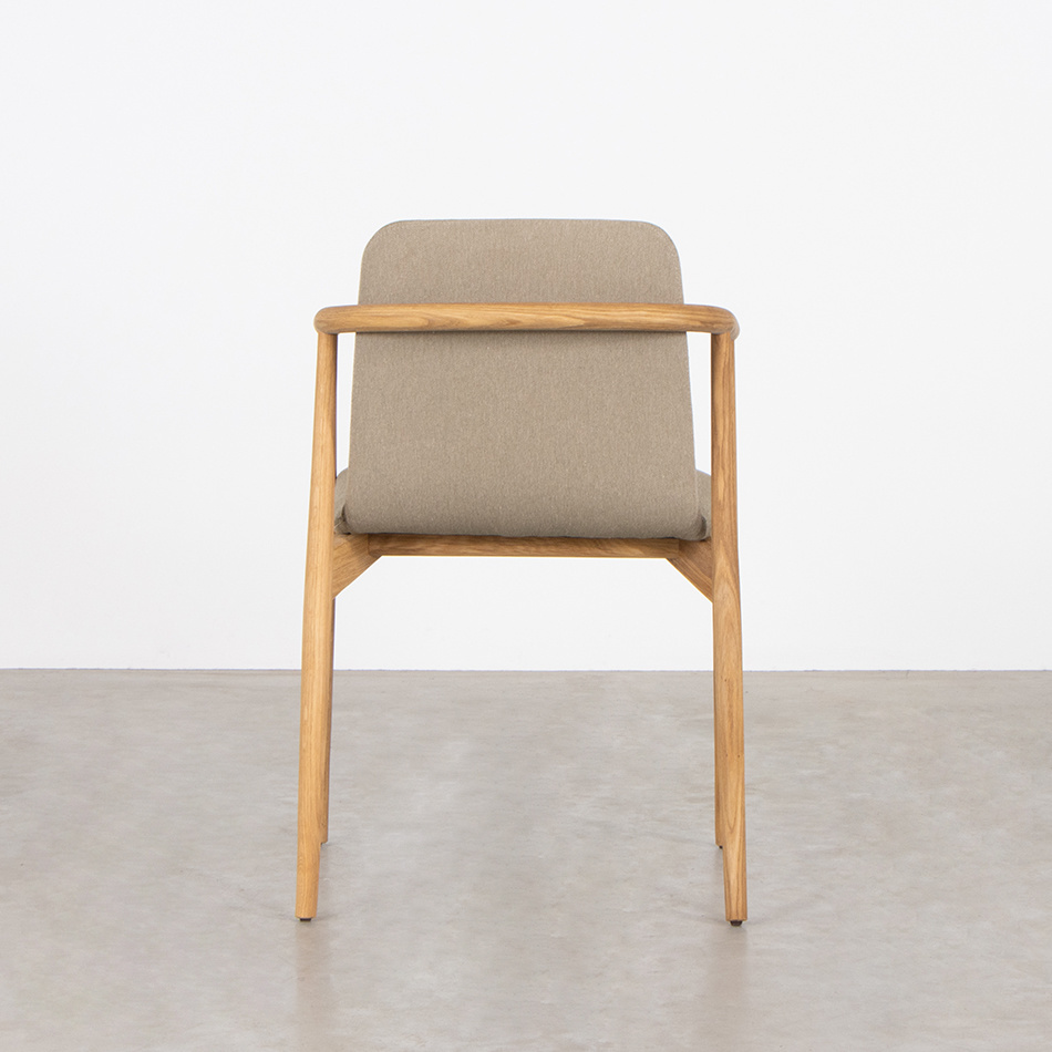 De ronde armleuningen zijn één geheel en lopen door aan de achterzijde van de stoel. Ze vormen de ruggensteun voor de zitting. De stoelpoten lopen door tot aan de armleuningen en hebben dezelfde ronde vormen. Het onderstel van de stoel zijn haaks geplaatste massief houten rechte dragers.