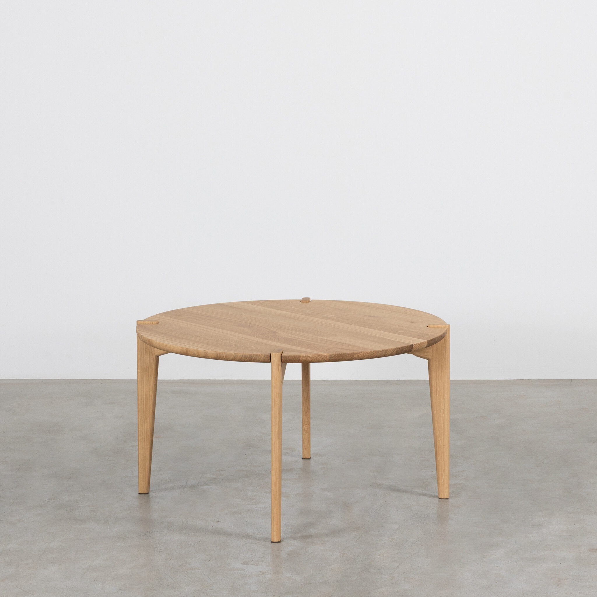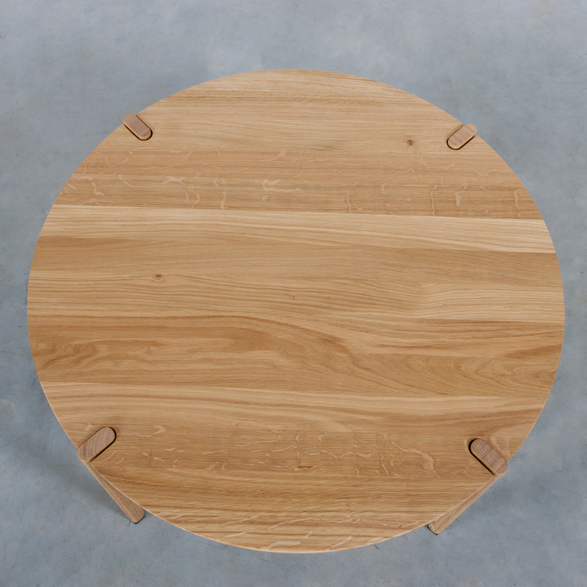 De Olfi is een ronde massief eiken salontafel, met een diameter van 70 cm. Een bijzonder detail zijn de subtiele, taps toelopende poten die door het blad heen steken. Deze innovatieve constructie zorgt niet alleen voor extra stevigheid, maar geeft deze ronde design salontafel ook een unieke en moderne uitstraling.