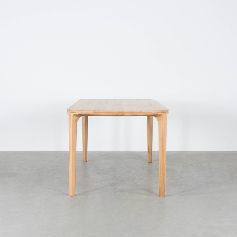 De Onni is een minimalistische en verfijnde massief houten tafel waarbij de vijfhoekige poten ogenschijnlijk doorlopen in het tafelblad. Het blad van de Onni tafel heeft een zacht en rond verloop.