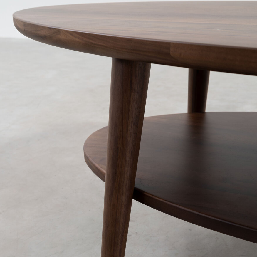 Salontafel Ove onderscheidt zich met zijn twee ovale bladen, waardoor je genoeg ruimte hebt voor drankjes en snacks, terwijl je afstandsbediening, tijdschriften of boeken altijd binnen handbereik blijven. De schuingeplaatste, taps toelopende poten geven deze ovale houten salontafel een speels en luchtig karakter. Dit Scandinavische design, vervaardigd uit massief notenhout, straalt warmte en natuurlijke elegantie uit. Dankzij de slimme vormgeving past Ove perfect in zowel moderne als minimalistische interieurs. Een stijlvolle én praktische keuze voor elke woonkamer!