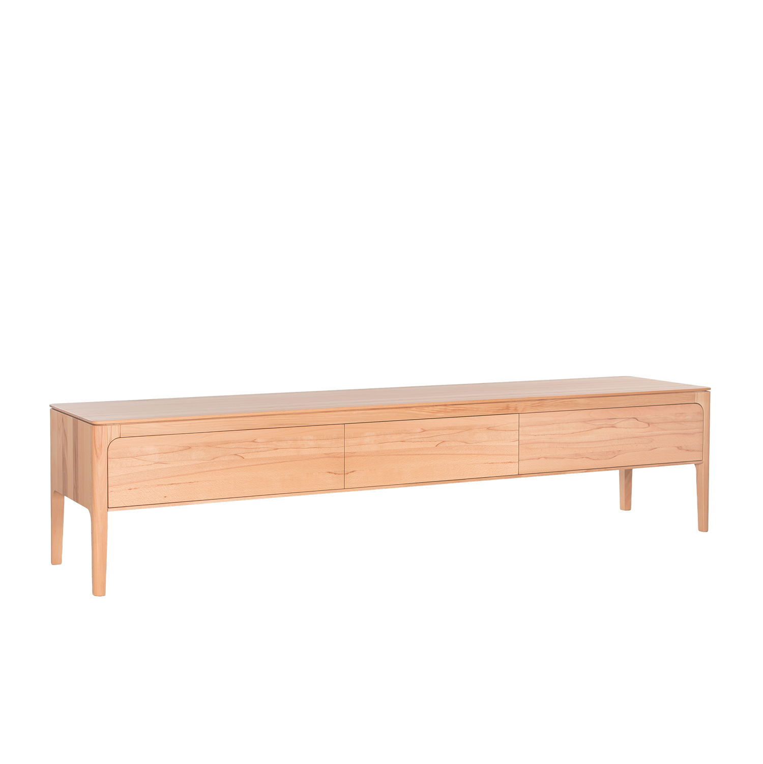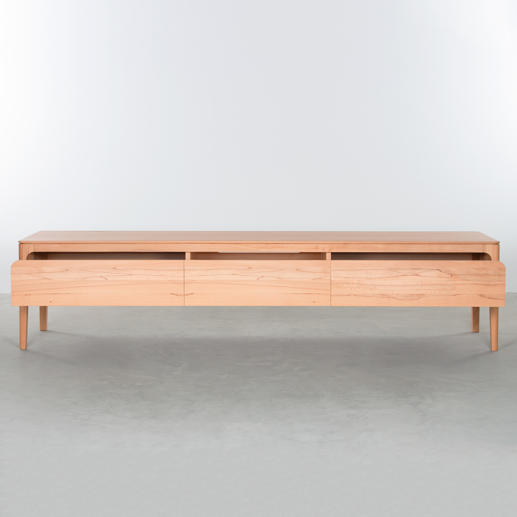 Ben jij op zoek naar een bijzonder beuken TV-meubel? Het Rikke TV-meubel is een massief houten TV-meubel, met een Scandinavisch ontwerp. Dit massief houten meubel heeft ronde vormen en een lichte uitstraling. De poten lopen in één subtiele vloeiende beweging door.