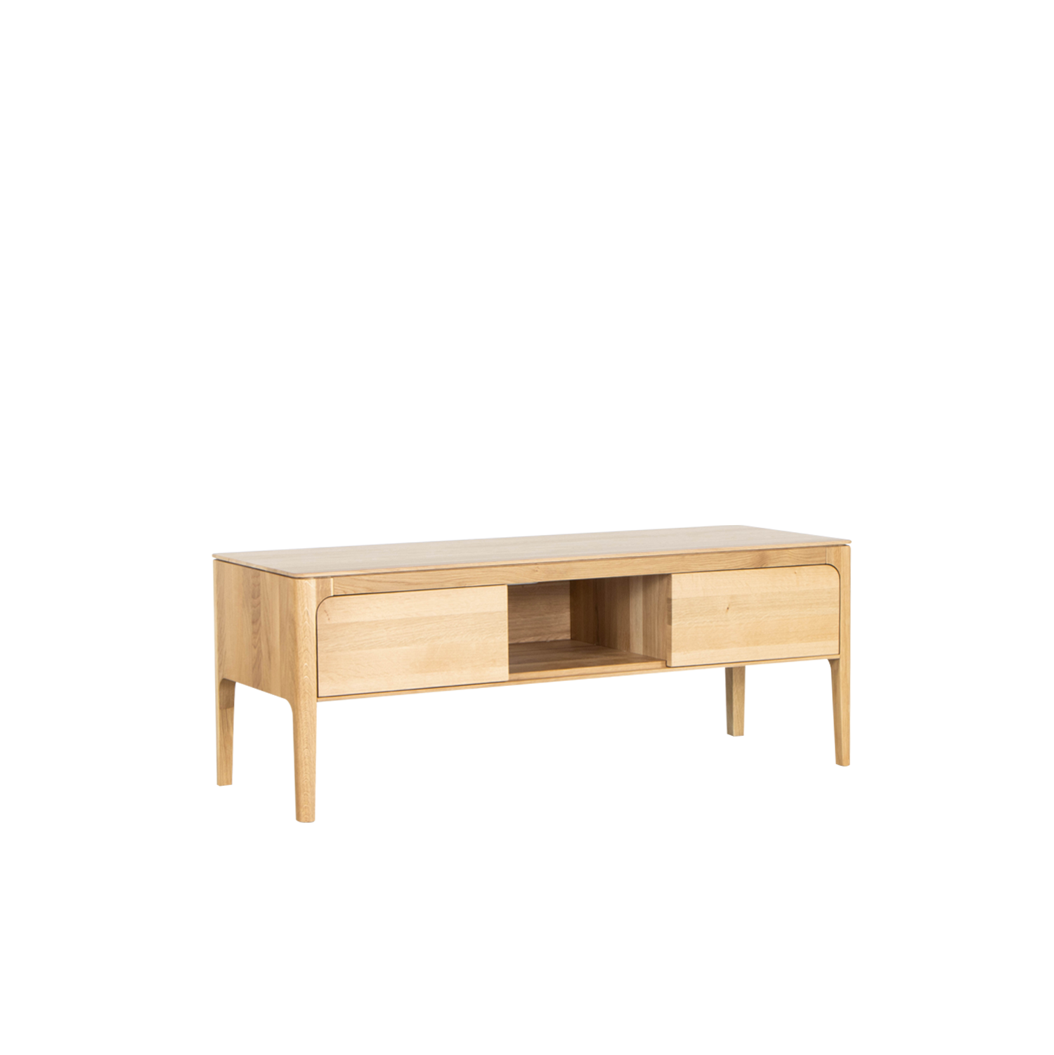 Ben jij op zoek naar een bijzondere eiken TV-meubel? Het Rikke TV-meubel is een massief houten TV-meubel, met een Scandinavisch ontwerp. Dit massief houten meubel heeft ronde vormen en een lichte uitstraling. De poten lopen in één subtiele vloeiende beweging door.