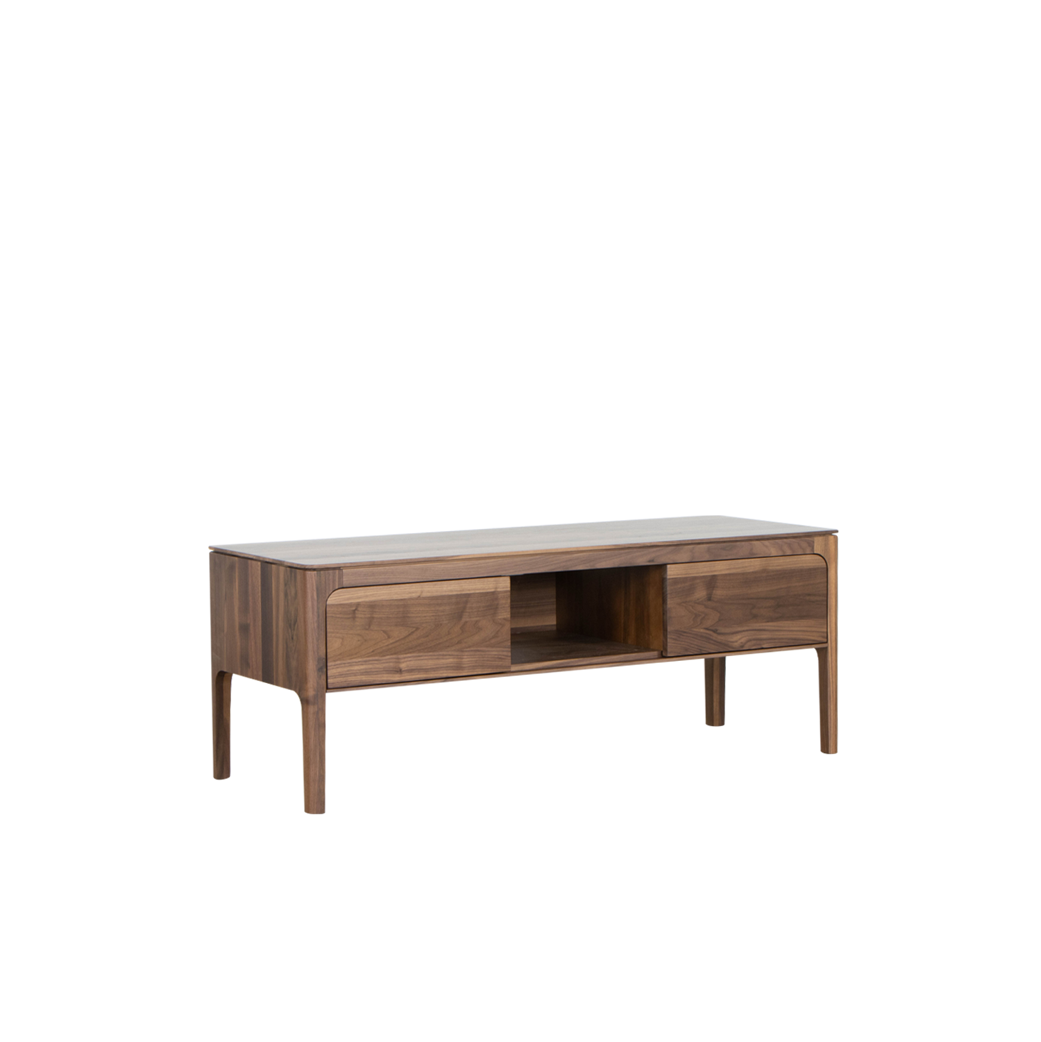 Ben jij op zoek naar een bijzondere walnoten TV-meubel? Het Rikke TV-meubel is een massief houten TV-meubel, met een Scandinavisch ontwerp. Dit massief houten meubel heeft ronde vormen en een lichte uitstraling. De poten lopen in één subtiele vloeiende beweging door.