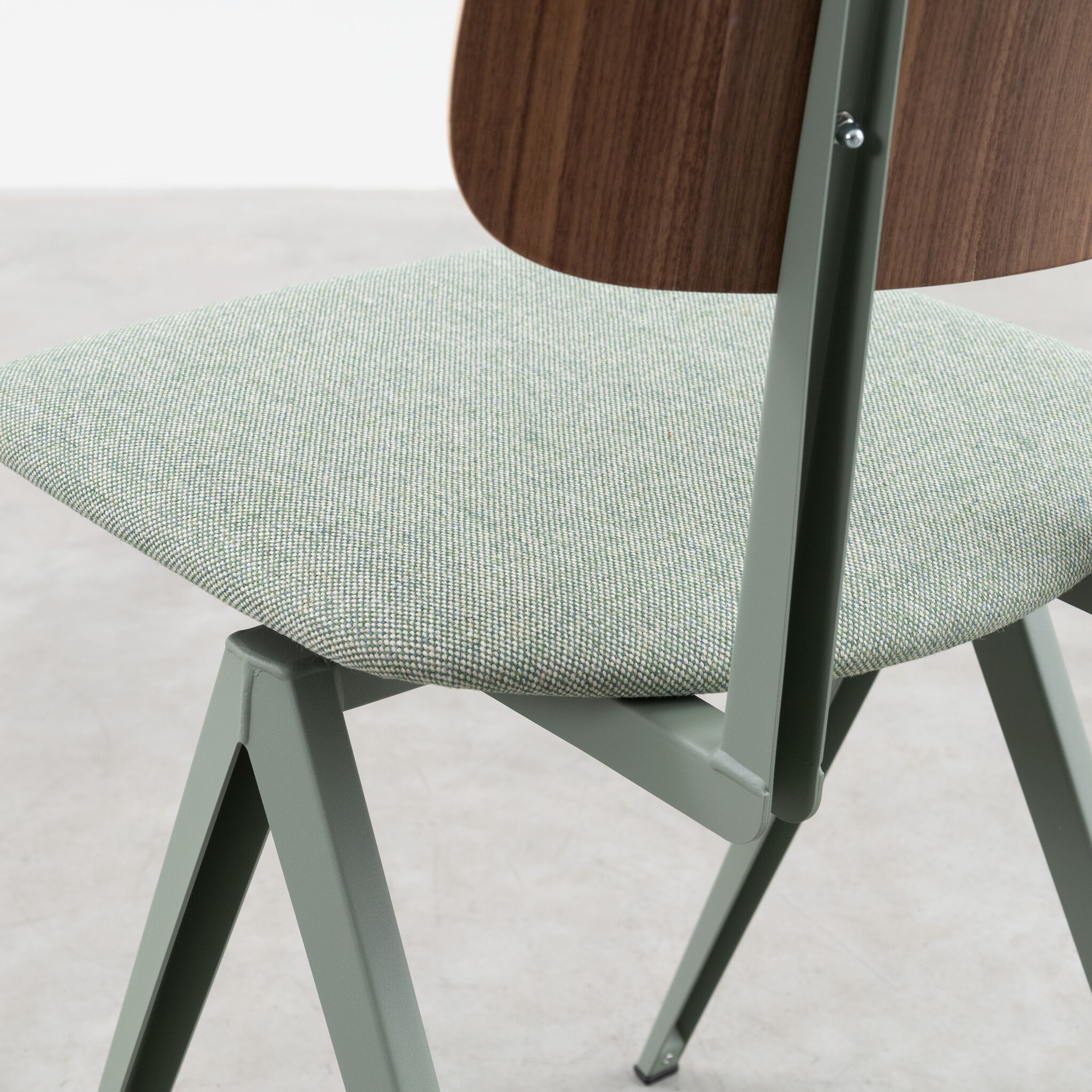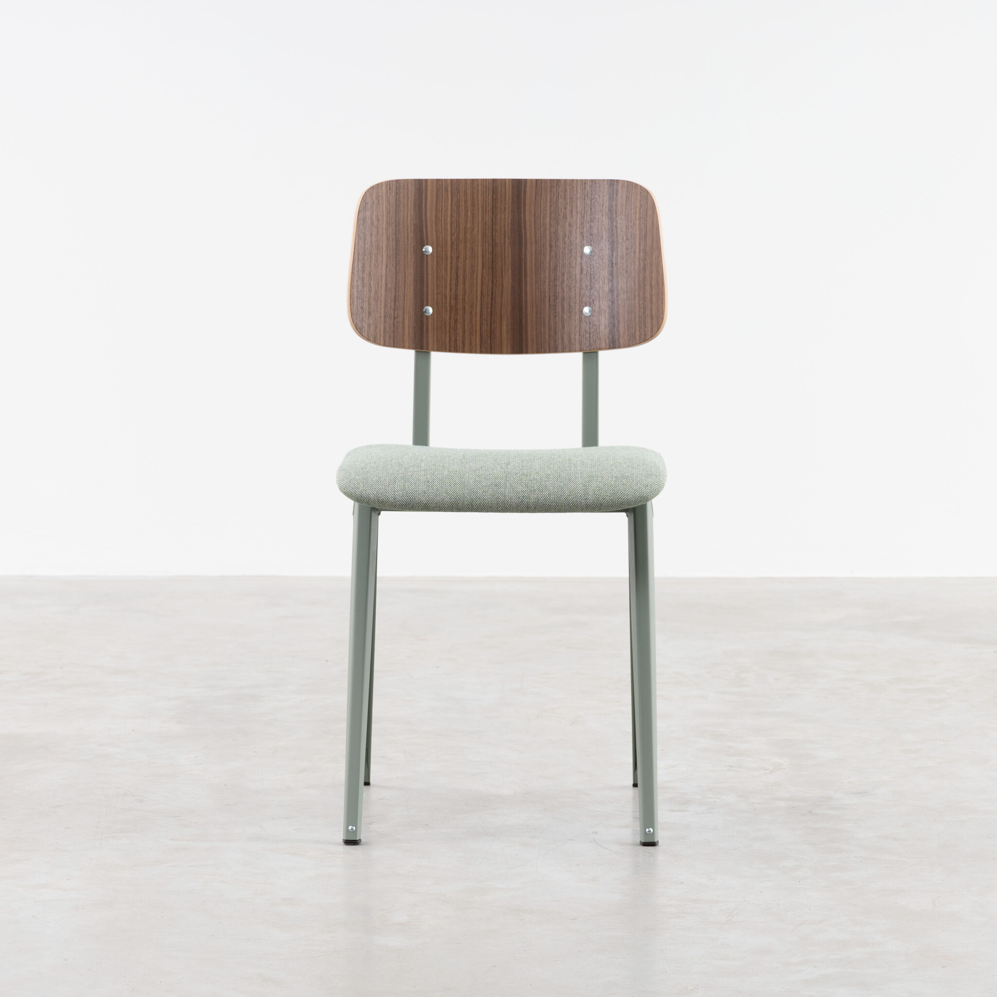 Materiaal: frame gemaakt van gevouwen plaatstaal. Zitting gestoffeerd. Rugleuning gemaakt van gelakt walnoot fineer.